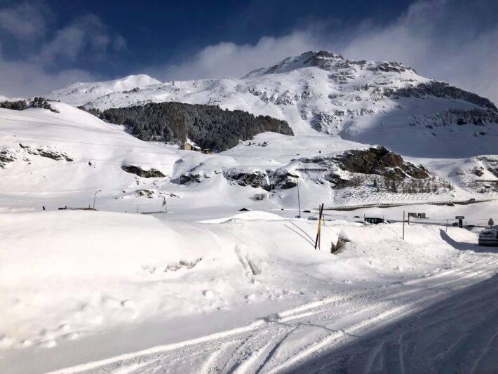 När vi kommer upp till Bivio som ligger i sluttningen upp mot Julierpasset öppnar sig ett vackert och inbjudande högalpint landskap. Det ligger ca 30 cm nyfallen snö, härligt! Parkeringen vid liften är inte stor, rymmer kanske 30 bilar, det här är inte Mayrhofen eller Ischgl precis.