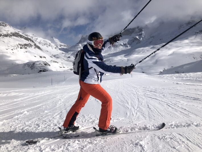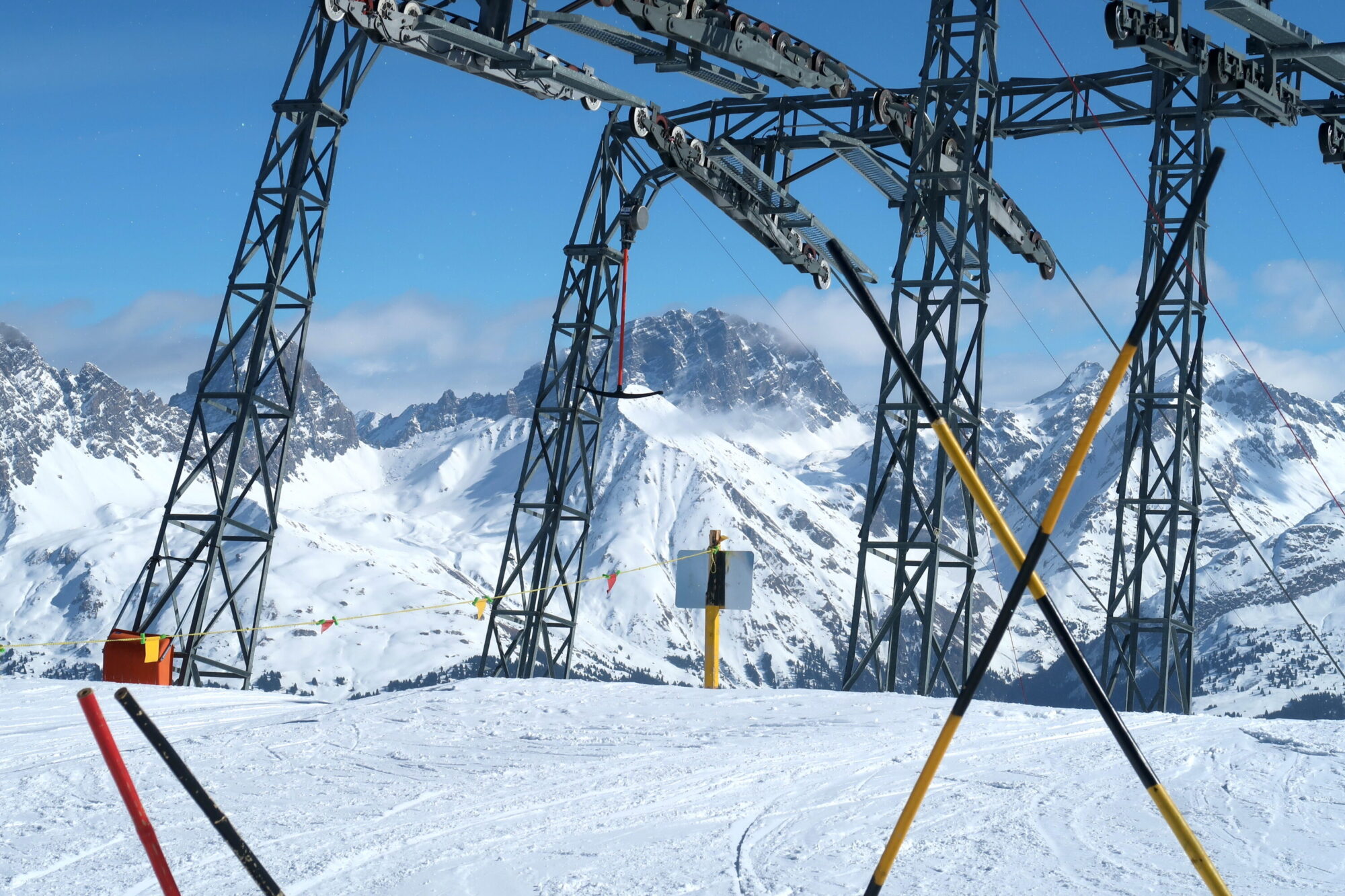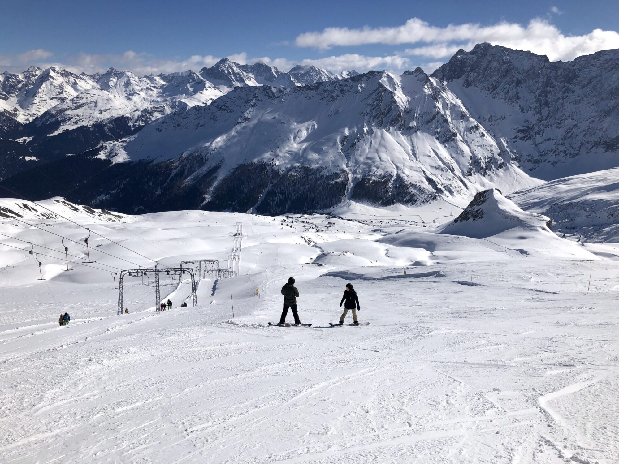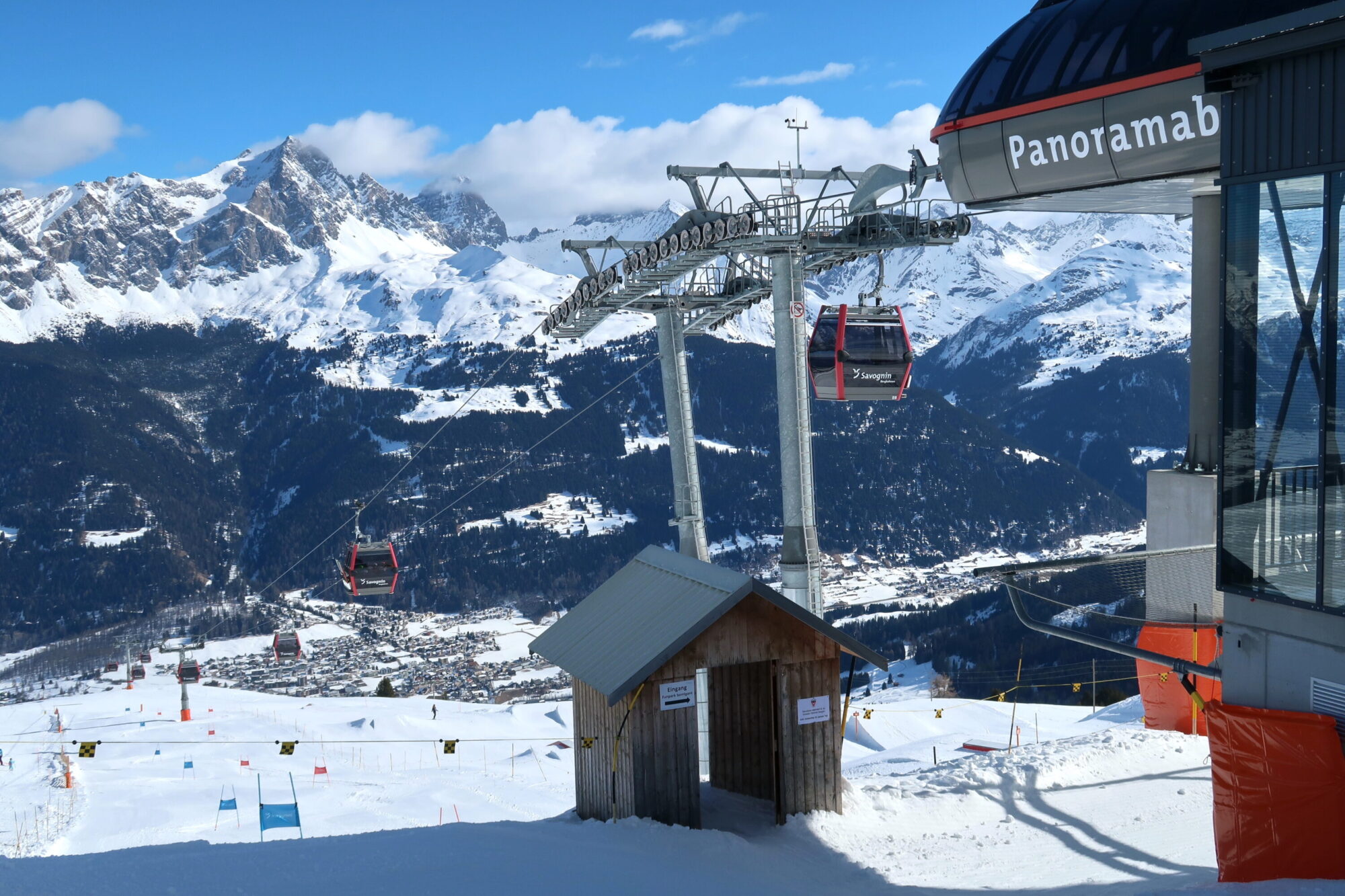 Vi köper två dagskort för 45 Schweizerfranc styck och åker upp i strålande sol och blå himmel med Schlepplift Tua. Den är lång och transporterar oss 430 meter högre upp, och här hade vi tänkt fortsätta med toppliften Al Cant, men det blåser här uppe och den är stängd idag. Vi får nöja oss med Tua och den andra ungefär lika långa liften Camon. De startar ganska långt ifrån varandra och möts i ett ”v” där de har sina toppstationer.