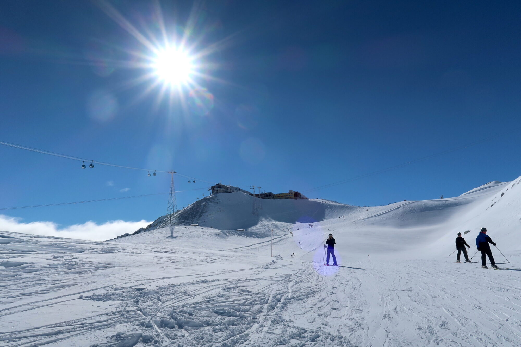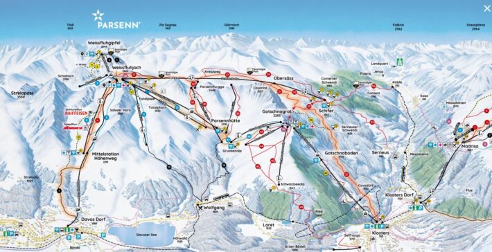 Davos ligger högt och Parsennbahn som startar på 1.560 möh släpper av oss uppe på Weissfluhjoch på 2.662 möh. I den här toppstationen går vi vilse! Det är en stor byggnad med flera övertäckta ”gator” som löper i olika riktningar och känns mest som en blandning av en tågcentral och en galleria. Till slut hittar vi ”gatan” som leder ut på baksidan mot Weissfluhgipfel som är skidsystemets högsta punkt.