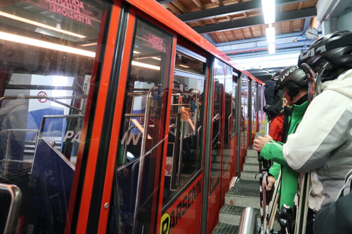 Vi tar från Davos centrum Parsennbahn, en modern bergbana med glastak upp till skidområdet. Här står vi också i den här skidveckans enda liftkö och det tar en 20-30 minuter innan vi är på väg uppåt. Det är en helt annan publik här, det är väldigt internationellt och vi hör att människorna kommer från USA, England, Tyskland, Italien, Skandinavien etc.