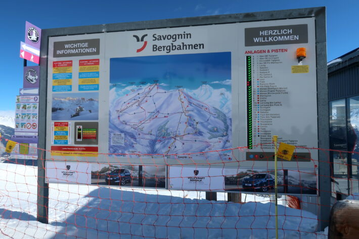 Det är strålande väder och vi bestämmer oss för att prova skidorten Savognin i Val Surses, endast 20 km och 20 minuter från Filisur. Efter en god frukostbuffé på Hotel Grischuna, så är det in med skidorna i bilen och iväg som gäller. Fru PisteCarver valde att ta med både pistskidorna och all mountainlaggen, medan jag som numera har slutat åka på pistskidor endast tog med mig ”bredisarna”. Savognin är med sina 80 km pist, vad som normalt skulle kallas ett mellanstort skidområde. Vi parkerar bland vad som ser att förutom vår bil vara 100% schweiziska gäster, huvudsakligen från kantonen Zürich.