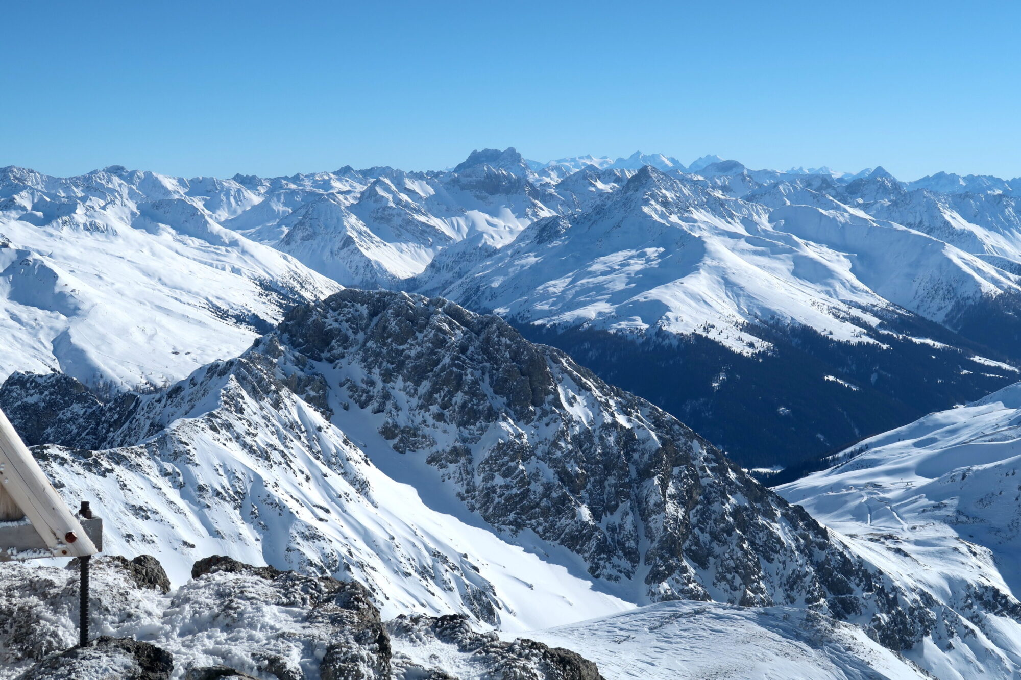 I väster ser vi Finsteraarhorn, och i sydväst ser man ner på den stora gryta som är skidområdet till den exklusiva orten Arosa. Åt söder reser sig längst bort Berninabergen vid St. Moritz, och i öster syns Silvrettabergen som fortsätter in i Österrike.