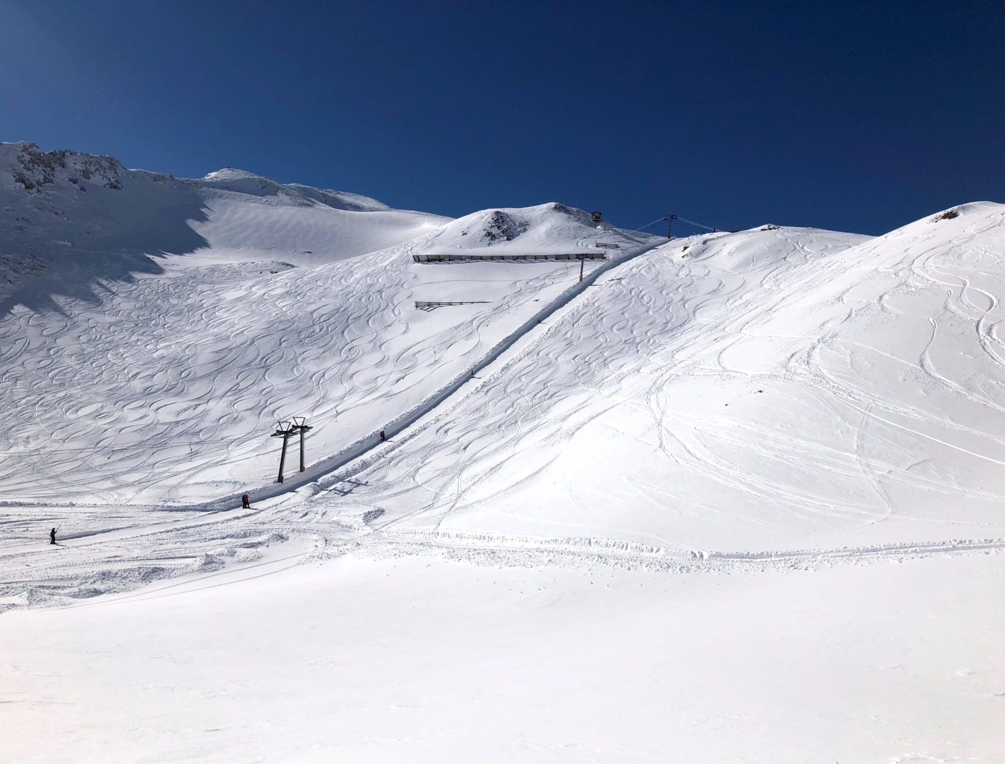 Efter lunchen drar vi bort till Schlepplift Nülli, och den ser på pistkartan ut att ligga bredvid Juonli, men i verkligheten ligger de i två skilda dalar och man kan inte se den ena från den andra. Här bjuds vi på en helt annan terräng än vid Schlepplift Juonli, det är högalpina varierade sluttningar i ett härligt omväxlande landskap (missa inte detta i slutscenerna i videon, som ligger längst ned i artikeln). Den här släpliften bjuder på en imponerande fallhöjd av 550 meter, och det går att svänga av från pisten hela vägen och hitta sin egen nerfart. Det är brett, det är långt och det är roligt att åka här!