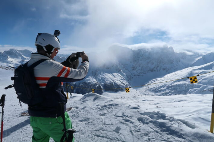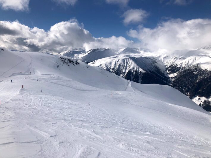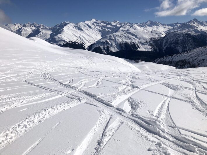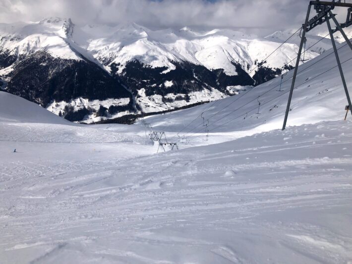 Landskapet är stort, öppet och fyllt med det största snödjupet vi sett hittills den här veckan. Detta håller oss på gott humör, för Davos-Parsenn har tyvärr ändå ett par nackdelar som vi upplever det. Det är väldigt mycket mer folk här än i de skidområdena som vi har åkt i de tidigare dagarna, och det är många som är nybörjare, så man får se upp och köra lite försiktigare. Inga liftköer uppe i systemet, men alla moderna express sittliftar skyfflar upp mycket folk i backarna.