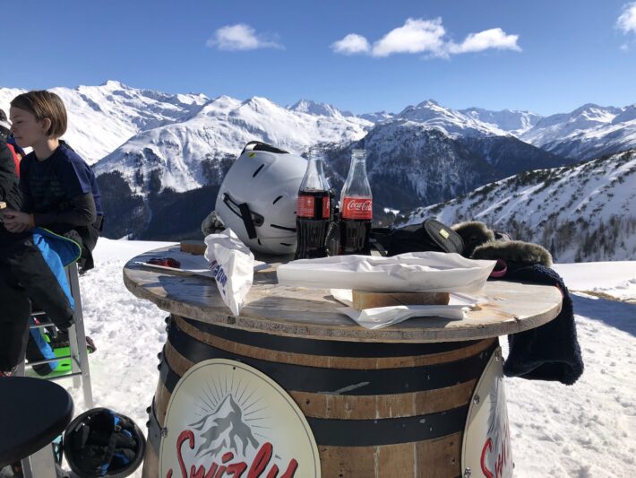 Vi hittar ett mycket trevligt lunchställe vid Gruobenalp, en utebar där man bl a grillar korv och serverar Prosecco i det strålande solskenet. Vi får tag i ett ledigt bord/tunna i snön och här äter vi våra (svindyra) grillkorvar med ett fantastiskt alp-panorama framför oss – detta är livet!