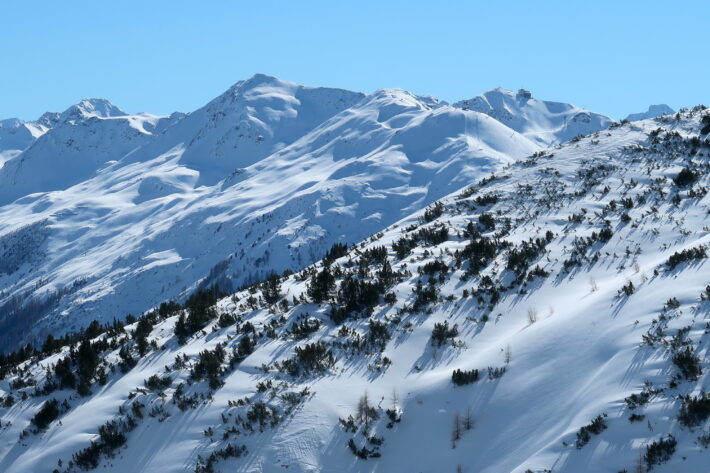 Åt andra hållet är Gruobenalp en gryta med många ravinsluttningar med gles skog, och spåren avslöjar att detta är ett omtyckt offpistområde för de avancerade skidåkarna.