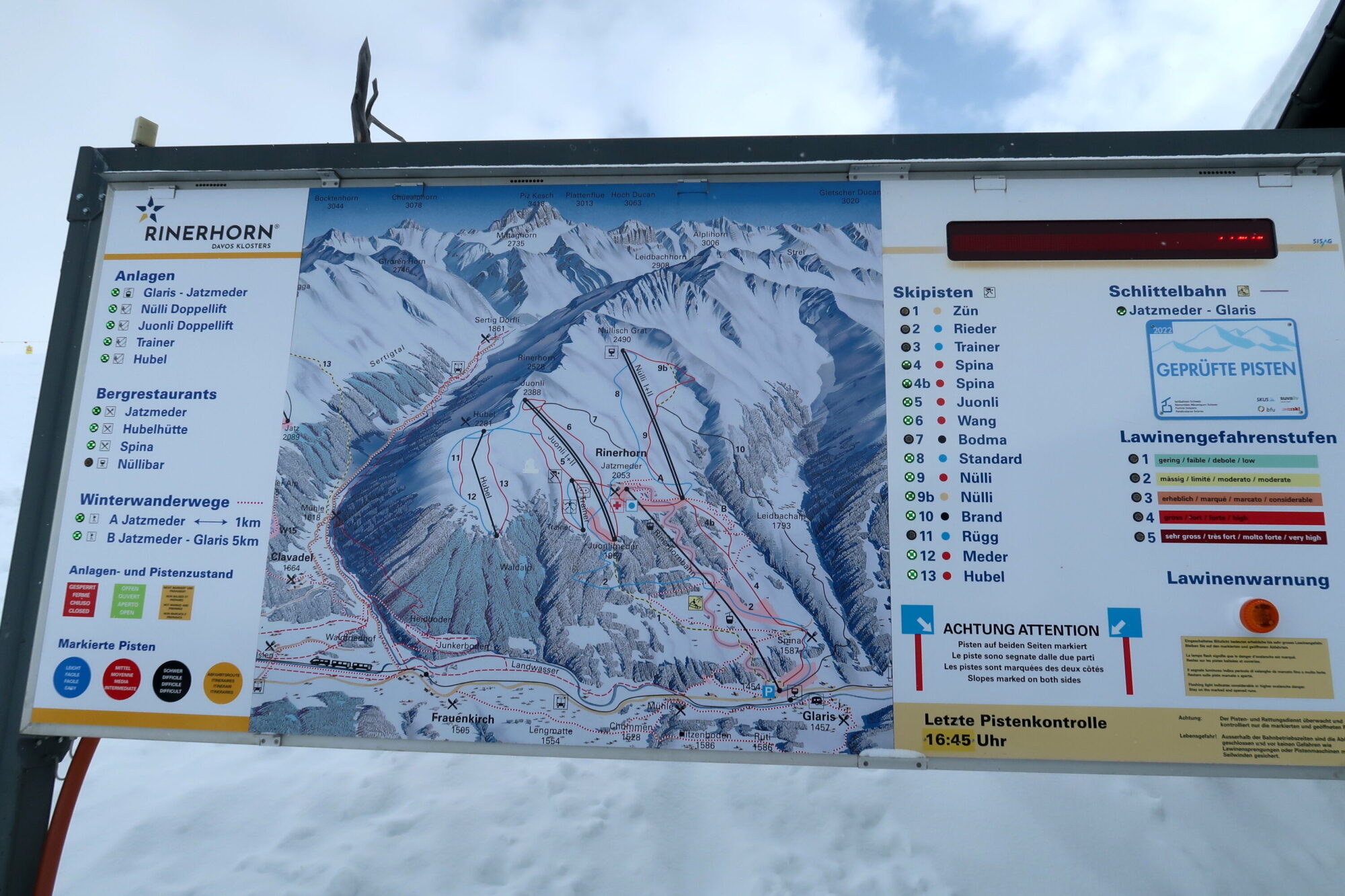 På pistkartan ser Davos-Rinerhorn inte mycket ut, men det här skidområdet blev en positiv överraskning. Det första man lägger märke till är att det återigen inte är mycket folk – skönt! Och det är som vi är vana vid den här veckan, bara schweizarna och vi två svenskar. När man kommer upp i området så har man tre släpliftar att välja på, och det låter ju lite torftigt. Men liften i mitten som heter Juonli, är ”carving heaven”. Nerfarterna på båda sidor är mycket breda och nästan helt jämna med röd lutning hela vägen. Dessutom lyfter släpen upp en med 450 fallhöjdsmetrar till toppstationen, vilket ger långa åk utan avbrott. En del kanske tycker det låter tråkigt med en jämn bred sluttning med 450 fhm, men för den som vill öva på sin carving teknik är det svårt att hitta något bättre. Eller varför inte bara låta skidorna ”sträcka på benen” i stora svepande bågar och höra hur fartvinden tjuter i öronen? Det är så glest med andra åkare här att man verkligen kan prova sina egna gränser utan risk för några kollisioner.