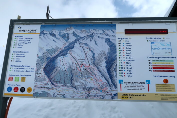 Det är moderna fina tågvagnar som bjuder på en kort och bekväm resa till Glaris i Albulatal. Framme i Glaris känns det inte som Davos precis, Glaris är vad man på engelska skulle kalla en ”hamlet”, och från den lilla stationen går vi bara tvärs över vägen till Rinerhornbahn som tar oss upp till skidområdet.