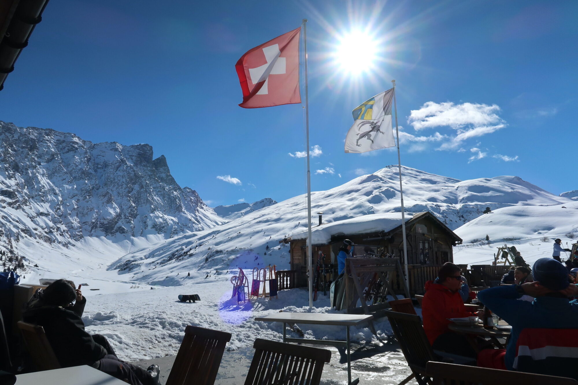 Efter ett par timmar kallar magen och det är dags för det som är så underbart i Alperna, att sitta ute på en terrass i strålande sol med mäktiga berg i bakgrunden. Vi sätter oss till rätta på Restaurant Steil’ Alva, och mot solen vajar behagligt den schweiziska flaggan med sitt vita kors bredvid Graubündens kantonsflagga.