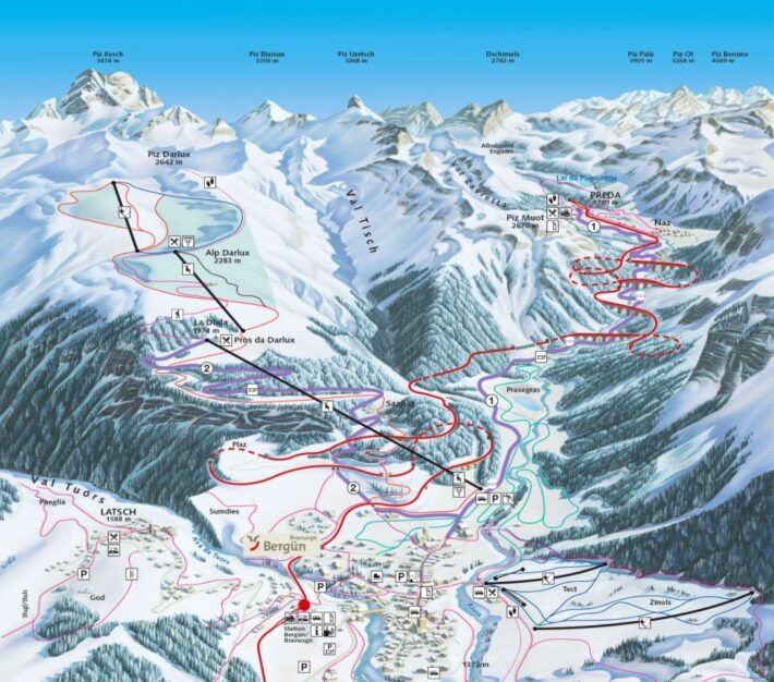 Darlux som området heter består av två gamla skruttiga sittliftar och en släplift högst upp. En höjdskillnad från 1.400 till 2.570 meter bjuds man på. Det tar lite tid att komma upp med de gamla sittliftarna, men väl uppe bjuds vi på en blick över en fantastiskt inbjudande skidterräng vid toppsläpliften Piz Darlux.