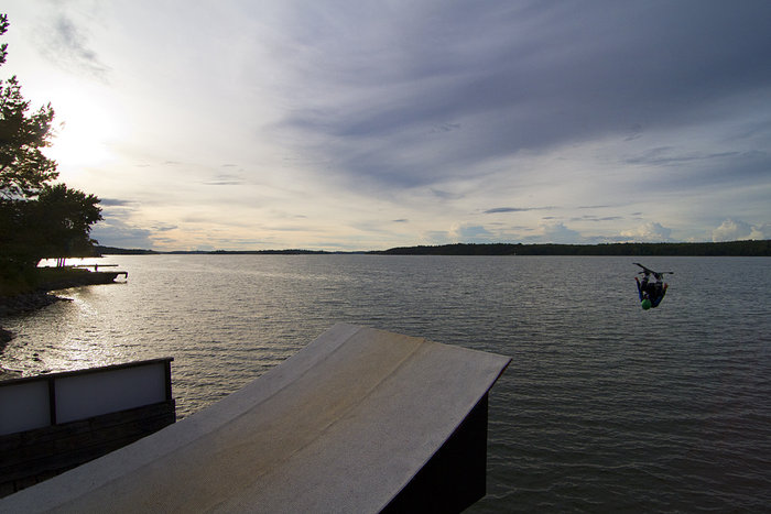 Foto: Hedda Beranderdet sju eller åtta personer som turas om att slänga sig i Östersjön den här kvällen, men det går ändå fort mellan hoppen. Ju fler som kör desto högre blir tempot enligt Emma, som snart svävar ut över vattnet igen.