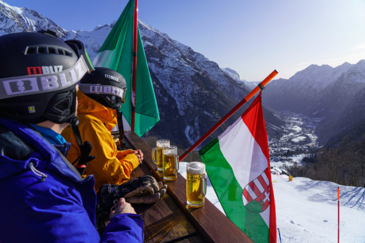 För att komma till Orestes Hütte behöver du ta en kabin som kräver ett speciellt ”Freeride Paradise” -lifkort. Ta kabinen upp, njut av utsikten och leta dig sedan nedåt för en lunch att minnas, länge.