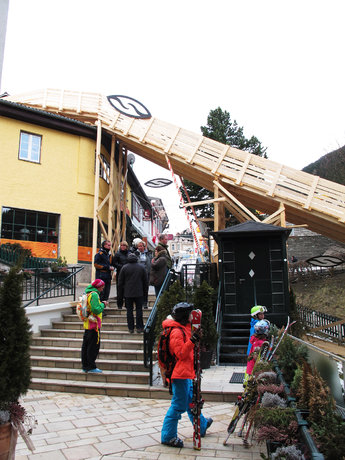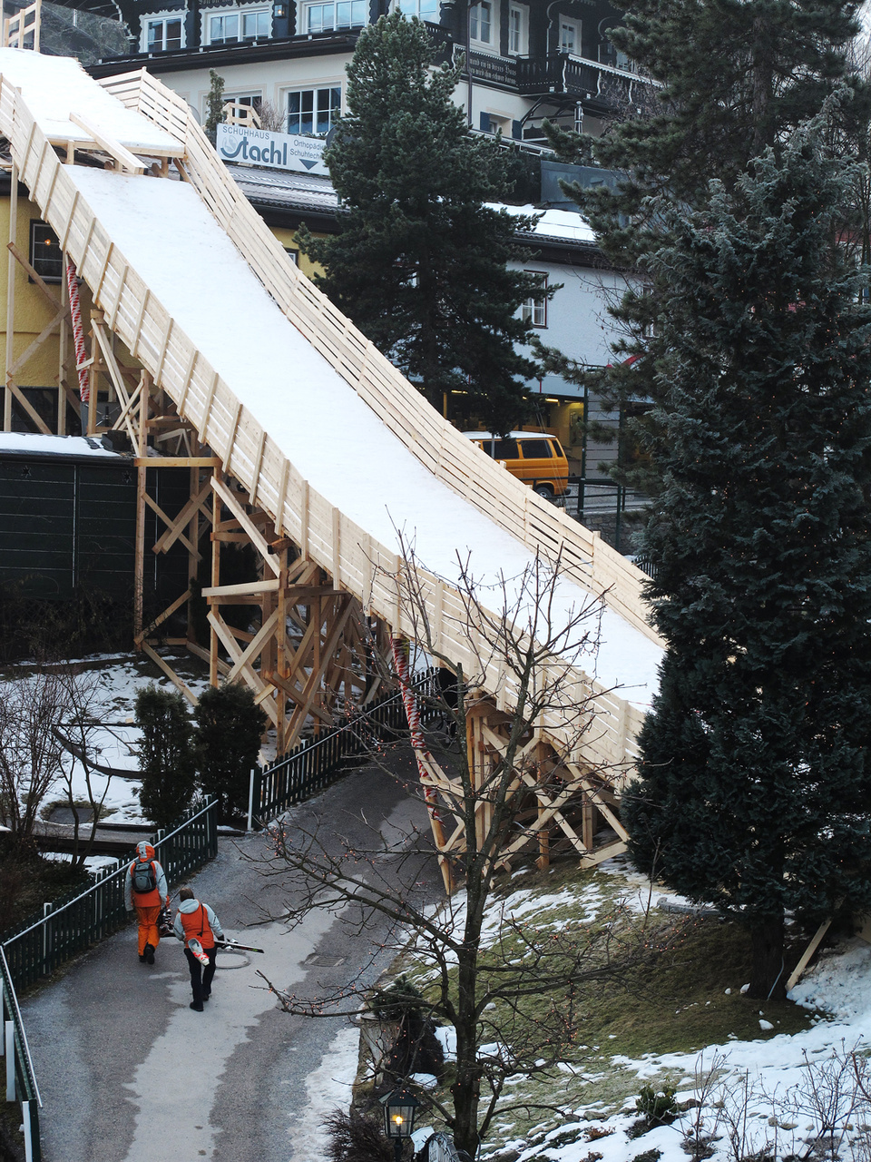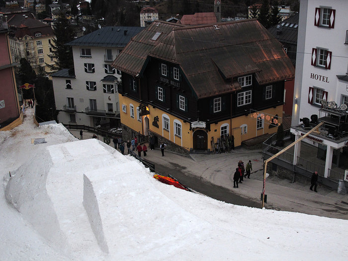 När jag anlände till Bad Gastein i lördags, tillsammans med ett helt gäng svenskar trodde jag att Bad Gastein satsade stort på infrastrukturen. Nya broar i stan? Men alla byggnadsställningar av trä som dyker upp i varje gathörn, över gränder och på hustak, handlar om nåt helt annat. Det är stommen till banan som slingrar sig från övre platån mellan Mozart Platsen och Hotel Salsburger Hof ner till torget i ortens nedre platå. Överallt finns det otroligt avancerade strukturer av trä som tillsammans bildar den häftiga slopestyle-banan.