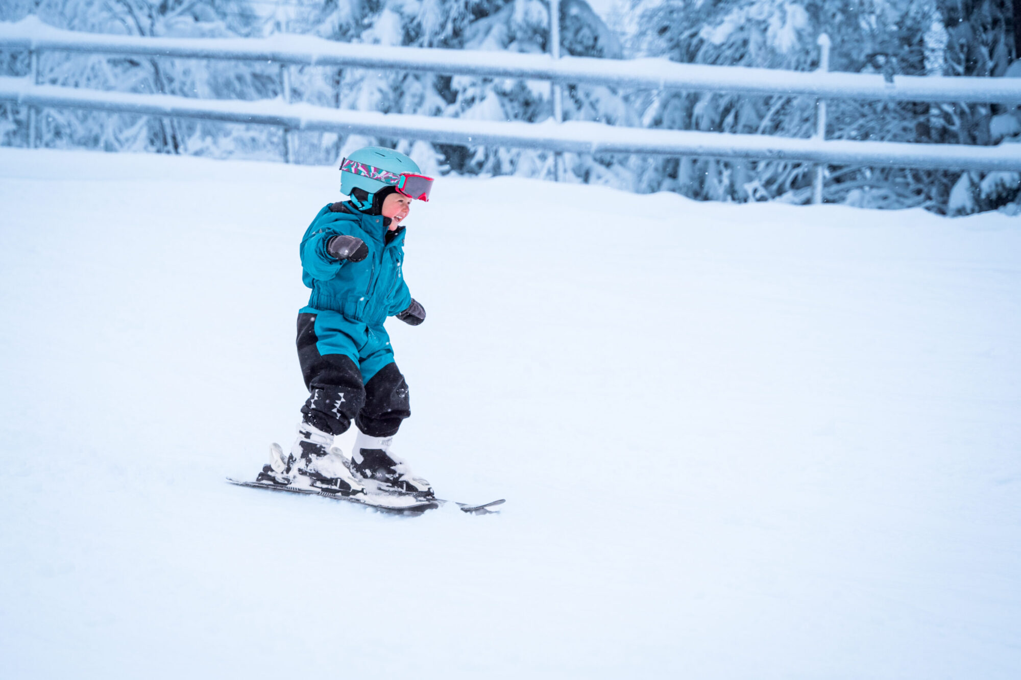 Den här resan är det dock fokus på barnen så skogen får stå orörd till någon annans stora glädje. Vi beger oss istället ner för första bästa pist. Det fluffiga täcket av nysnö har blivit uppkört och underlaget är minst sagt utmanande.