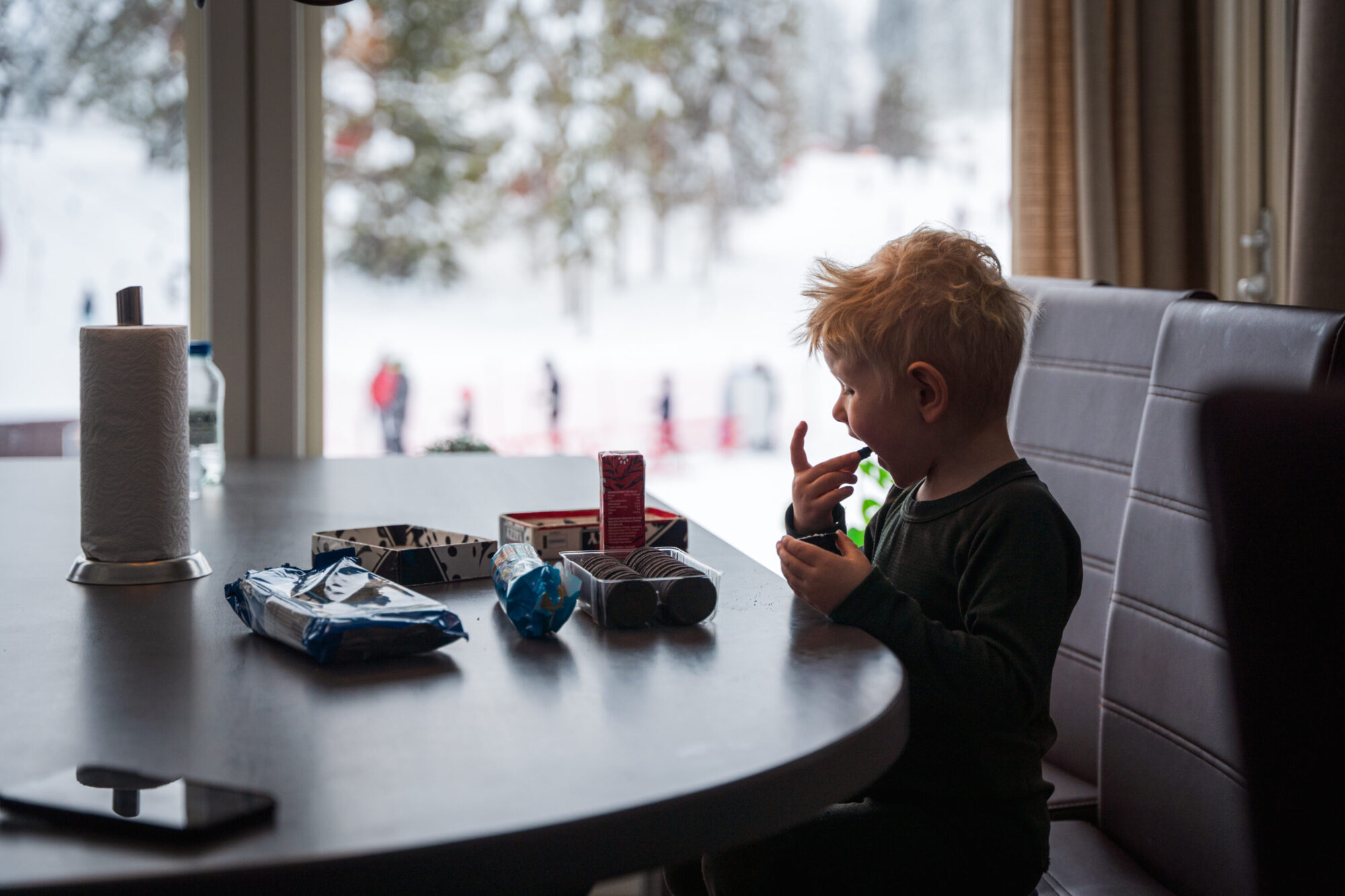 Sagt och gjort. Vi tar oss in i skogen för att utforska terrängen mellan de snötäckta granarna. Snön ligger djup och det är fortfarande ospårat i skogen vilket gör att barnen har svårt att navigera mellan träden. Ett lyxigt problem kan tyckas, i synnerhet denna snöfattiga vinter.