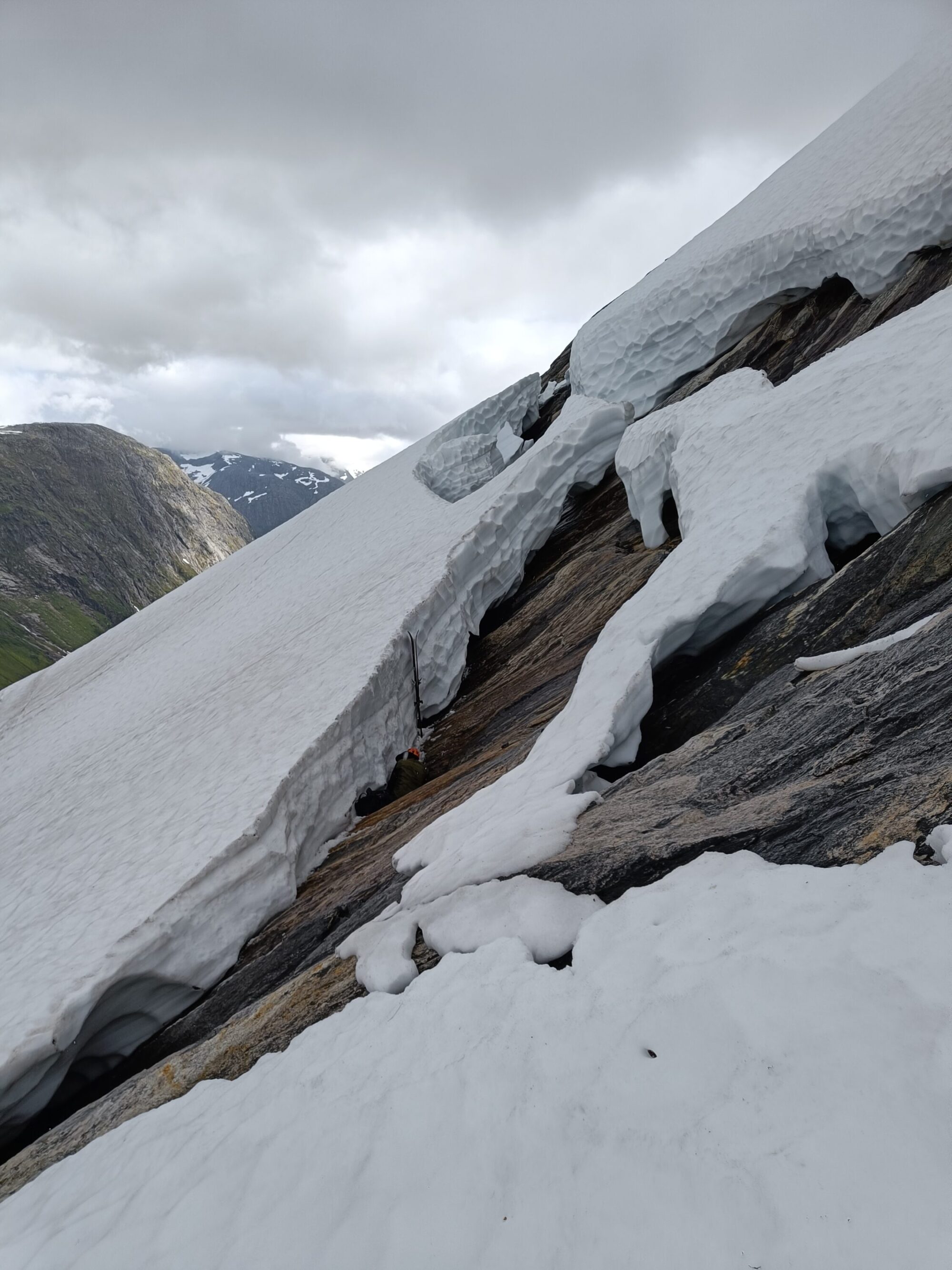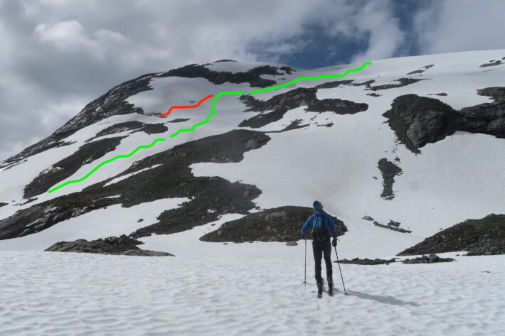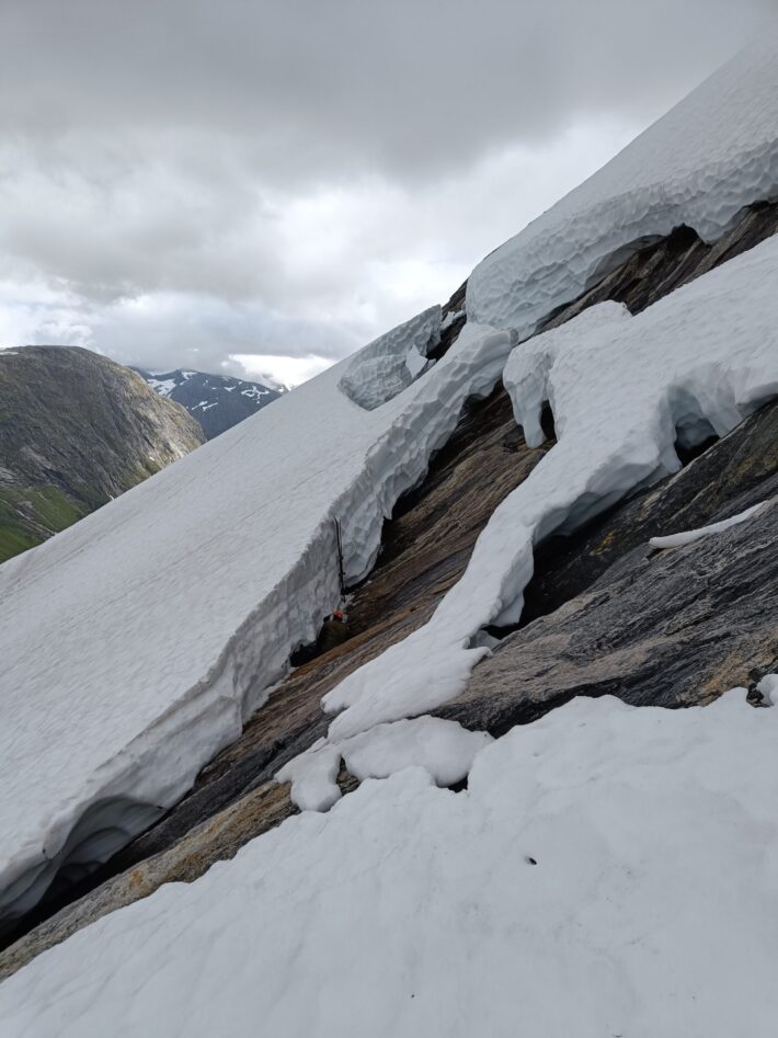 Bård tog bilder längs vägen upp som han skulle kunna ta hjälp av för att grunda sitt vägval nedför. När han börjar åka nedför avviker han något från den planerade linjen då han ser en fin ryggfromation med tillsynes fin snö. Plötsligt dyker sprickor i snötäcket upp, först några mindre som Bård lätt kan hoppa över, men därefter öppnar en stor spricka upp sig i snön som inte gick att väja för.
