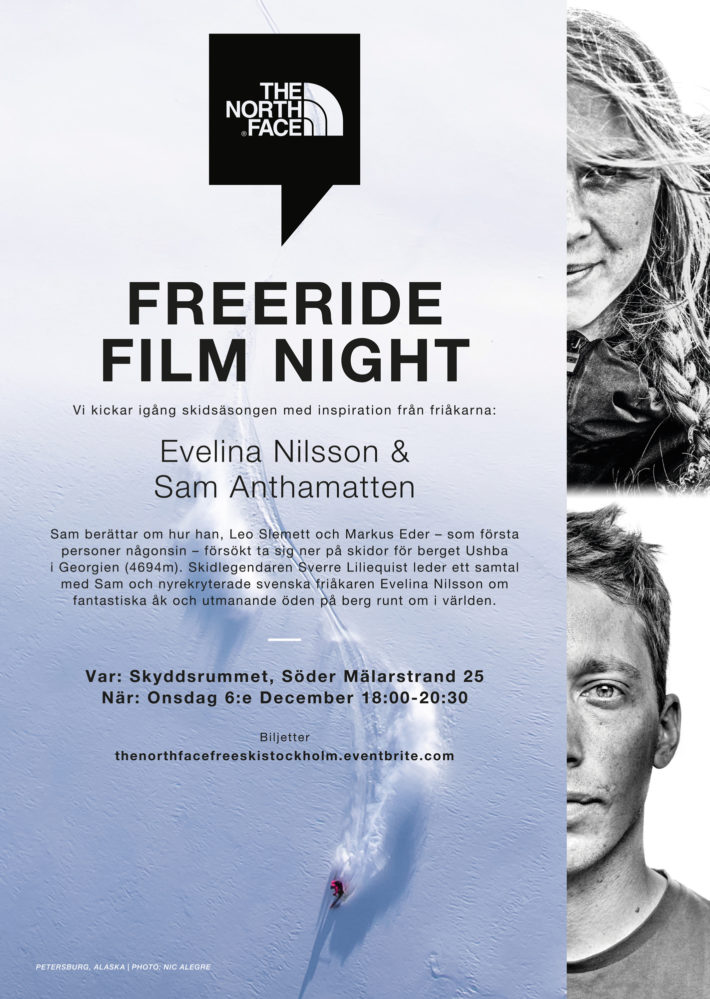 På onsdag 6 december är det dags för film- och inspirationskväll i Stockholm. Du ser skidfilmen ”USHBA” om Samuel Anthamattens storslagna skidäventyr i Georgien. På plats är också den alltid lika andliga skidåkaren Evelina Nilsson. Sverre Lillequist håller i moderatorsmikrofonen och arrangörerna The North Face och Freeride bjussar på mat och dryck, samt give aways. Biljetterna är gratis.
