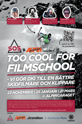 Det blivit dags för Too Cool For Filmschool, som är en gratis ”filmskola” med målet att få skidfilmintresserade i rätt riktning, ha kul och dela med sig av sina erfarenheter. Det tunga artilleriet, som under tre träffar i vinter kommer bjuda på tips och idéer, dela med sig av sina erfarenheter och bjuda inspiration, är: