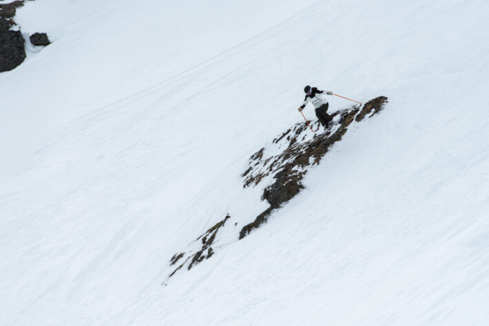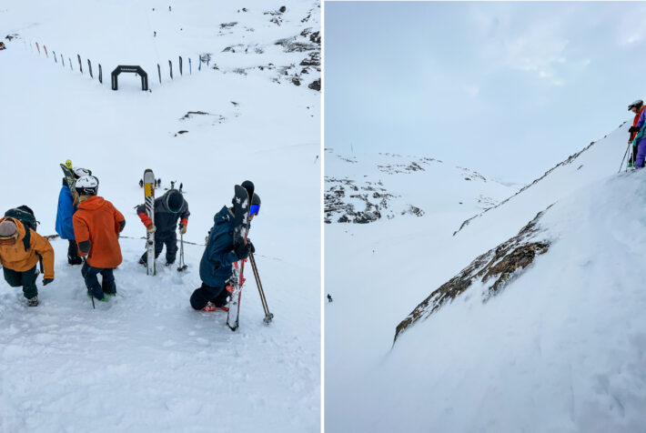 Ravinen är välfylld med snö i år, men sol och vind har tagit det bästa ur lookers left-sidan och blottat en rejäl hockeyrink för de åkare som väljer att ta sig in i Ravinen från ridgen ovanför Kaj-klippan. Min spaning är ändå att samtliga landningar är mjuka och det är egentligen bara det provocerande kontrastlösa ljuset som blir den riktigt stora utmaningen idag.
