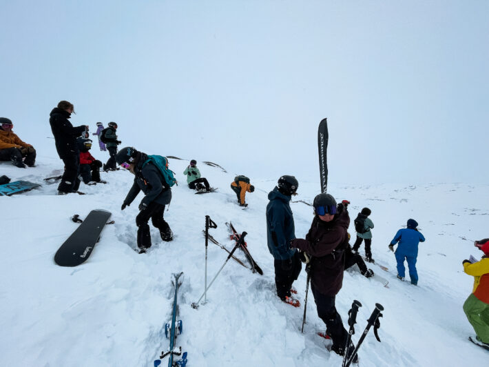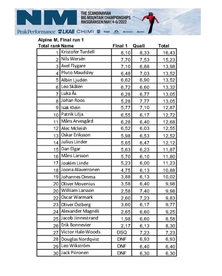 Om det då inte vore för att siste man kvar på start har ett gäng vinster från både Freeride World Tour och NM i bagaget. Kristoffer Turdell åker på ett sätt som gör att det ser lekande lätt ut, som att någon häller en klump kvicksilver på toppen av berget och sen bara låter den rinna ner den naturligaste vägen, helt effortless. Linjevalet är nästintill identiskt med Nils men belönas med högre poäng från domarbåset.
