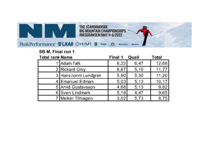 Gårdagens kvaltvåa, Melker Tillhagen, i Snowboard Herr, ramlade tyvärr i ravinen. Däremot Adam Falk, som hade med sig en riktigt bra poäng från gårdagen, ställde ner ett snyggt och stabil åk där han först attackerade hockeyrinken vänster om ravinen med nyvässade stålkanter för att sedan flyga ut från både Klumpen och Klustret och kunde glida i mål två stoppade landningar i bagaget.