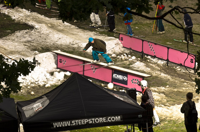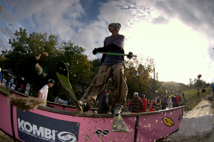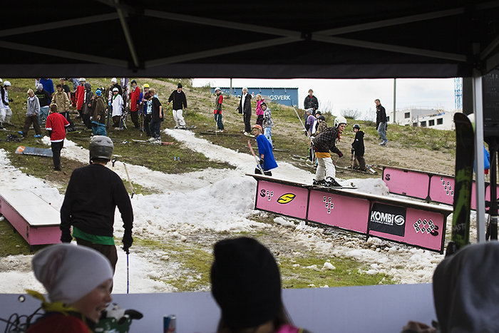 Först upp till Eric och tillbaka iförd skid- och brädoutfit stod som segrare av ett par nya goggles från Smith. Det blev en riktigt rolig pausunderhållning som bjöd på många skratt i publiken. Strax efter kom en bil med släp med snö rullandes, folk var snabba med att ta tag i spadarna och hjälpa till. Setupen klar strax klar för andra delen av kvalet.