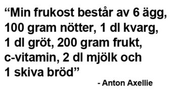 – Bara min frukost består av: 6 ägg, 100 gram nötter, 1 dl kvarg, 1 dl gröt, 200 gram frukt, c-vitamin, 2 dl mjölk och 1 skiva bröd. Sedan äter jag sex gånger om dagen.