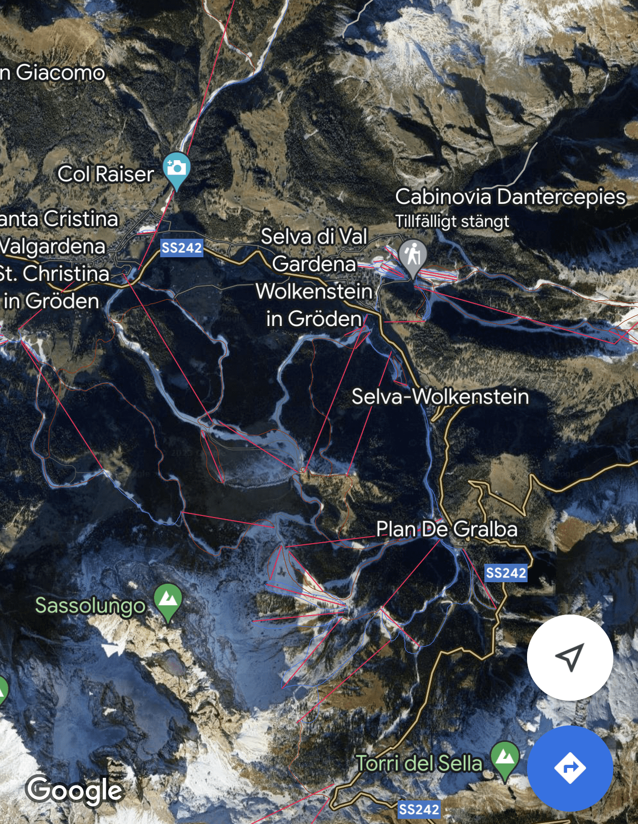 satellite view på Google Maps ger en ganska rättvisande bild… Täckande snö i pisterna (tills liftsystemen stänger för säsongen) men inte mycket utanför.Hur brukar snöläget vara i Dolomiterna i slutet av mars?
