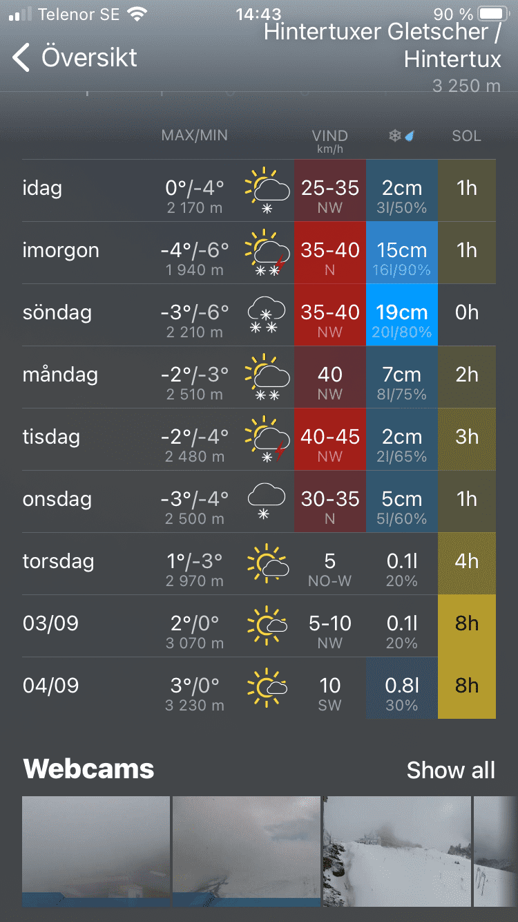 Just nu så har vi bara 10 grader i byn( Mayrhofen) och det snöar på glaciären -4 igår. Så backarna högst upp funka det är mycket träningsgrupper här nu.Gå bara in på Bergwetter Tirol så får man bra koll. Bättre komma innan novemberloven då är det en massa tyskar holländare osv här och som regel första åken för dom så man får se upp!!⛷⛷⛷⛷