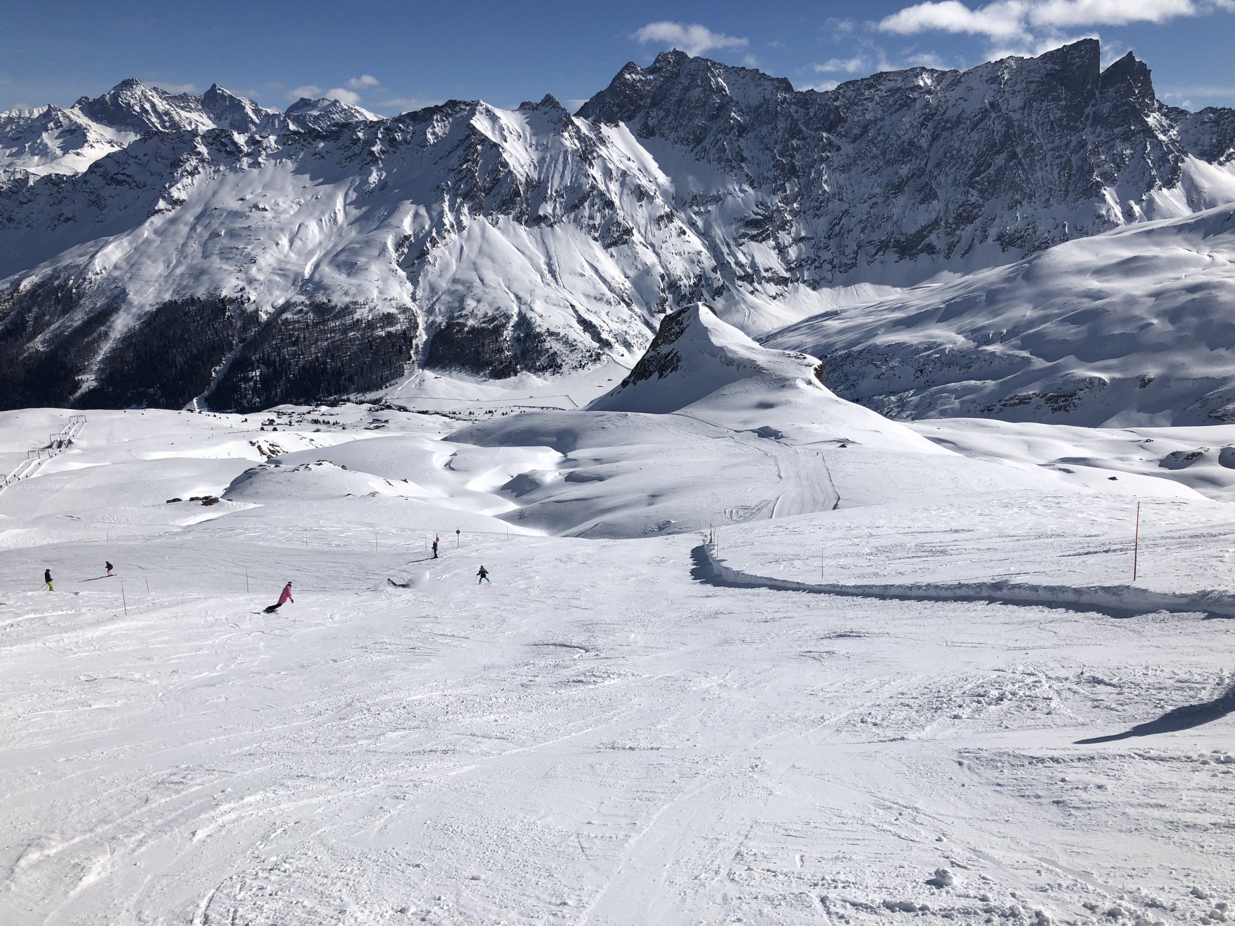 I den stora grytan ner mot Gruobenalp finns det lättåtkomliga offpist möjligheter. Men med en 3:a på lavinskalan håller man sig i skinnet.