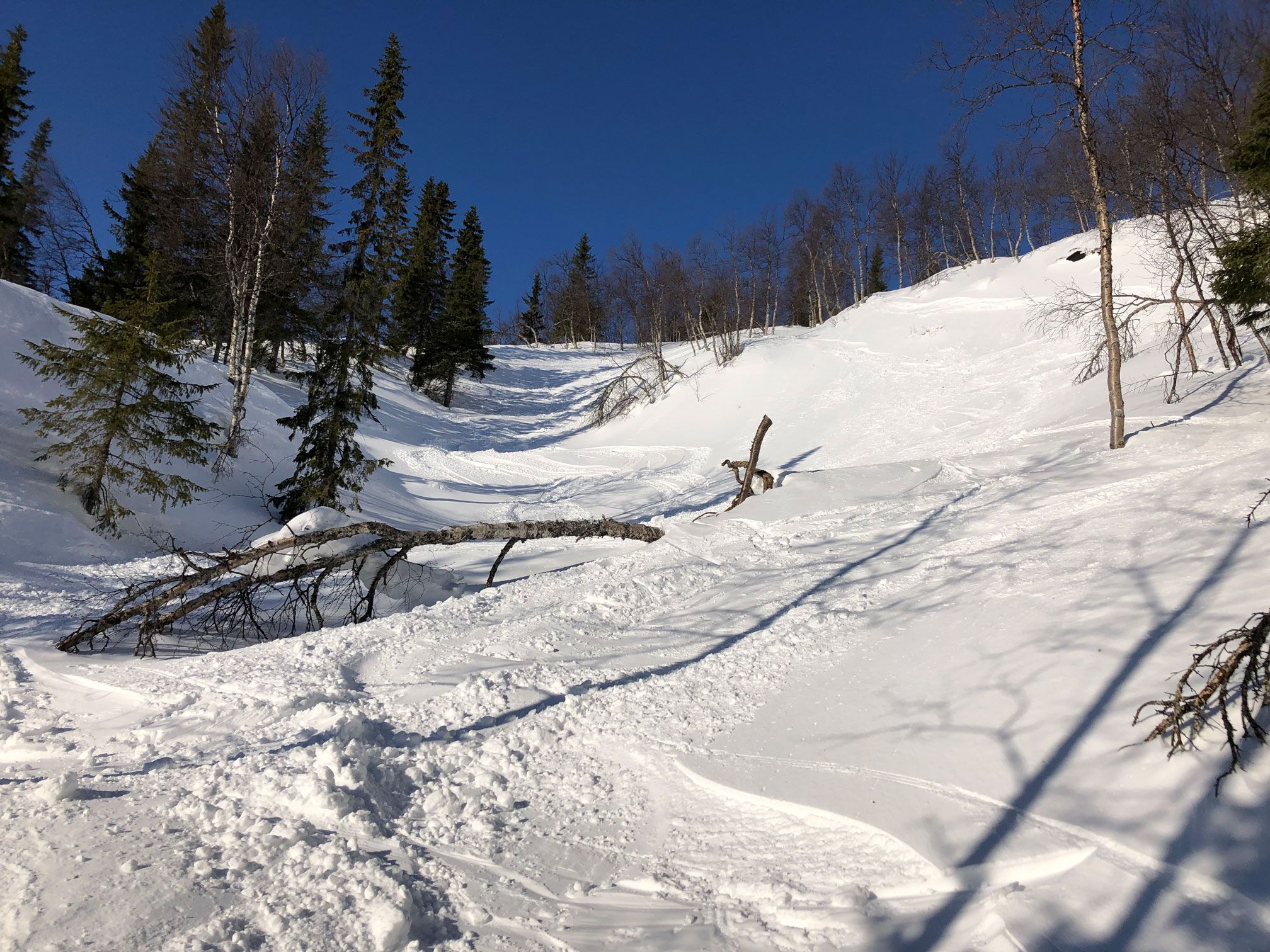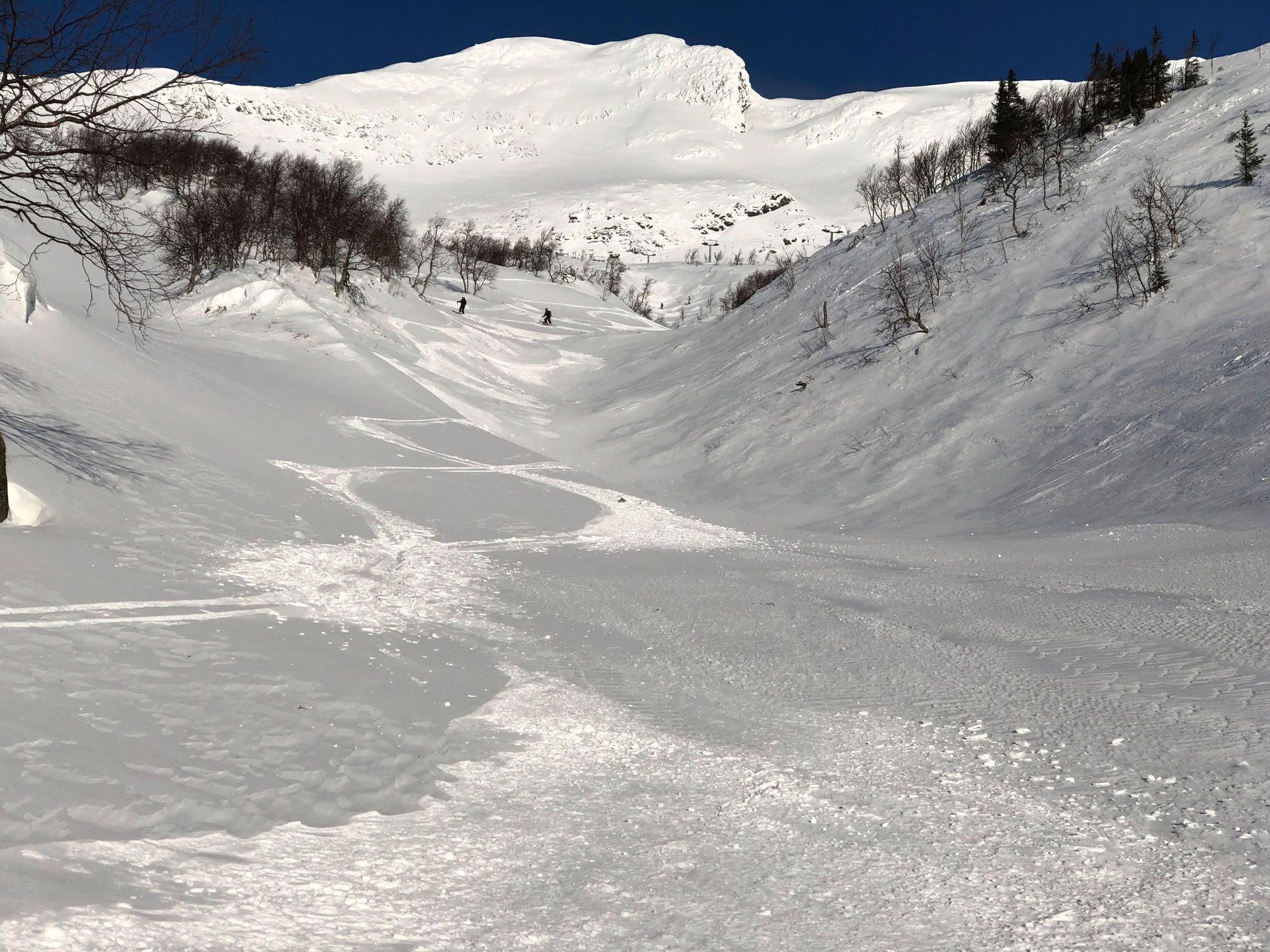 Snöade ett par centimeter igår och under natten som med hjälp av kraftig vind blåst in i ravinerna och mellan träden. Basen är stenhård. Och där det är pistat rekommenderar jag skridskor, åtminstone på förmiddagen fram till solen har mjukat upp underlaget. Två bilder från imorse.