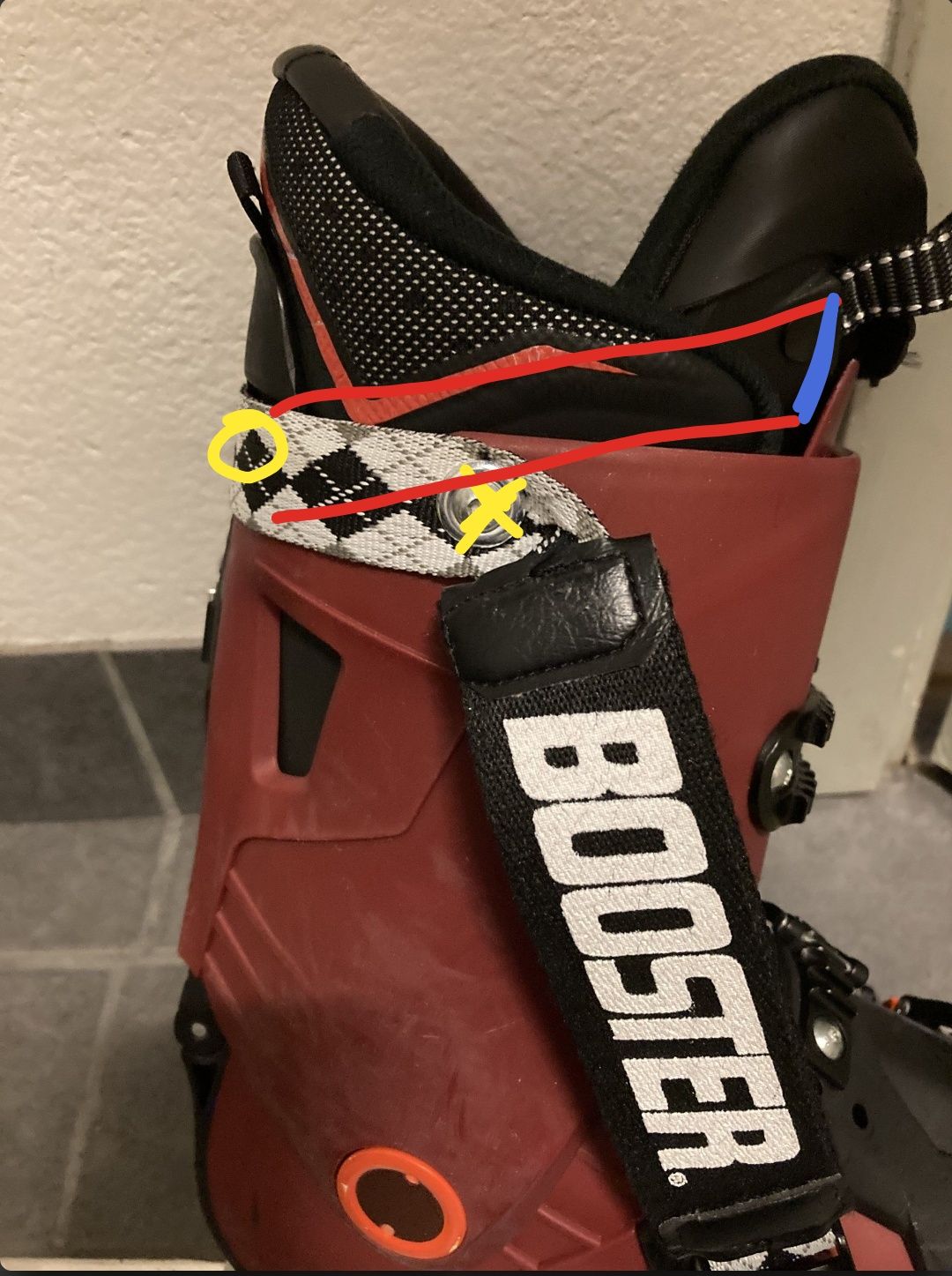Min booster består av tre elastiska band som är betydligt tjockare än originalet. Jag fick inte till det bra att ha den innanför skalet. Men pjäxor ser olika ut. Havreboll föreslog ovan att vinkla strapen, man kan laborera lite som man vill för att få till det. Jag hade en extra manschett och tyckte det var kul att testa skära bort material för en bättre effekt. Jag hade inte fått till det så bra utan att göra det. På mina Lange (och sannolikt även dina) fanns även en försänkning i plasten där man skulle skära. Så det är inte helt taget ur luften att skära bort material (på de pjäxorna) för att få strapen tightare mot benet.