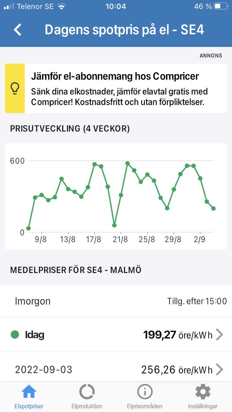 Elpriset just nu med alla skatter och avgifter inkluderade är ungefär 6 kr/kWh i EO4 och 5 kr/kWh EO3.