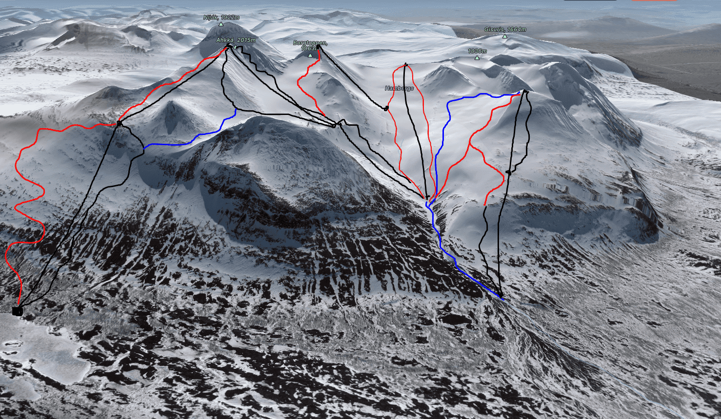 Längst upp i bilden startar Mårdsundsbodarnas lift, ungefär där den gamla startade. Den går upp en bit ovanför trädgränsen och där kan man tänka sig byte eller en mellanstation. Sista biten går i den grunda dalgången upp till Jämthön. Nu har jag bara ritat in tre liftar men man kan ju en som servar grytan mellan Västerfjället och Jämthön, alternativt glider man ner till gondolen/sittliften på Västerfjällets nordsida.