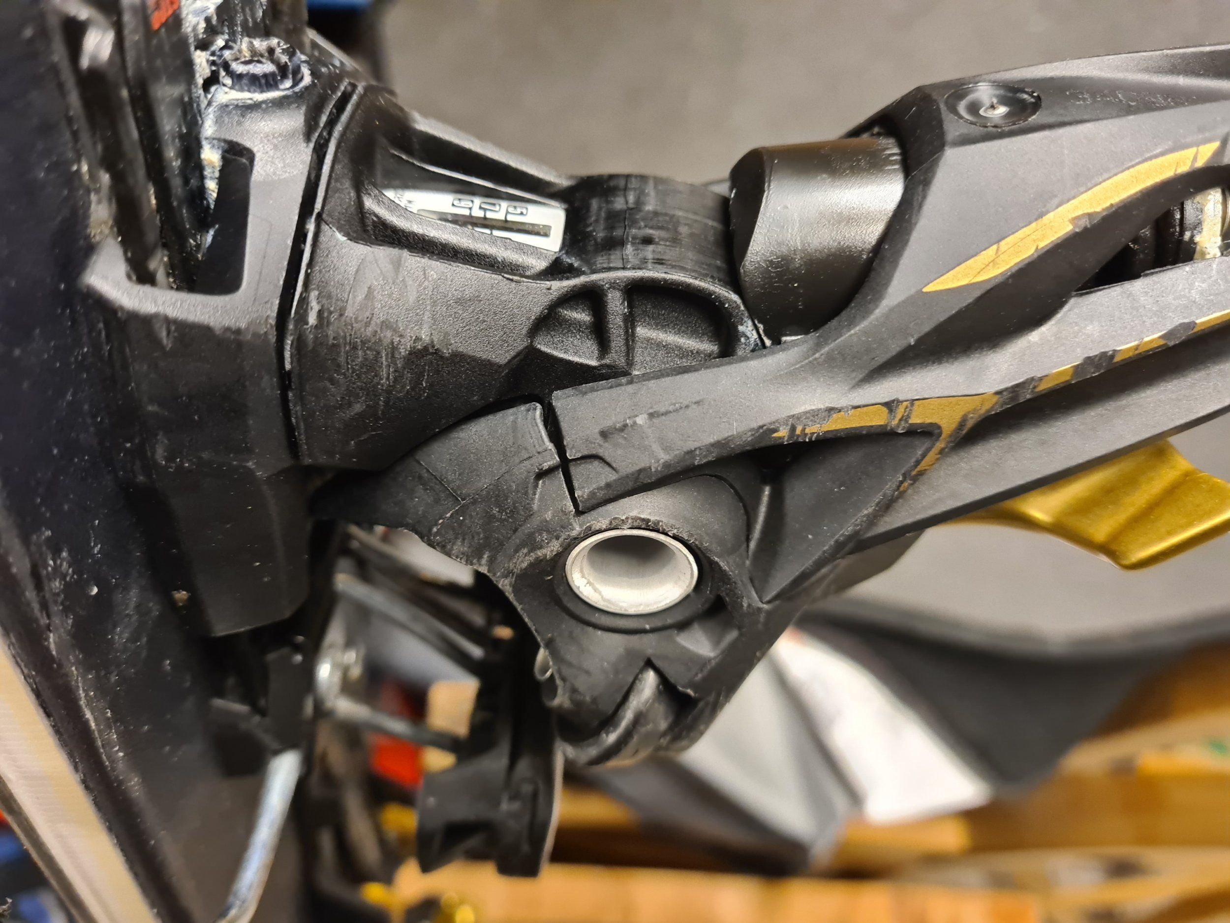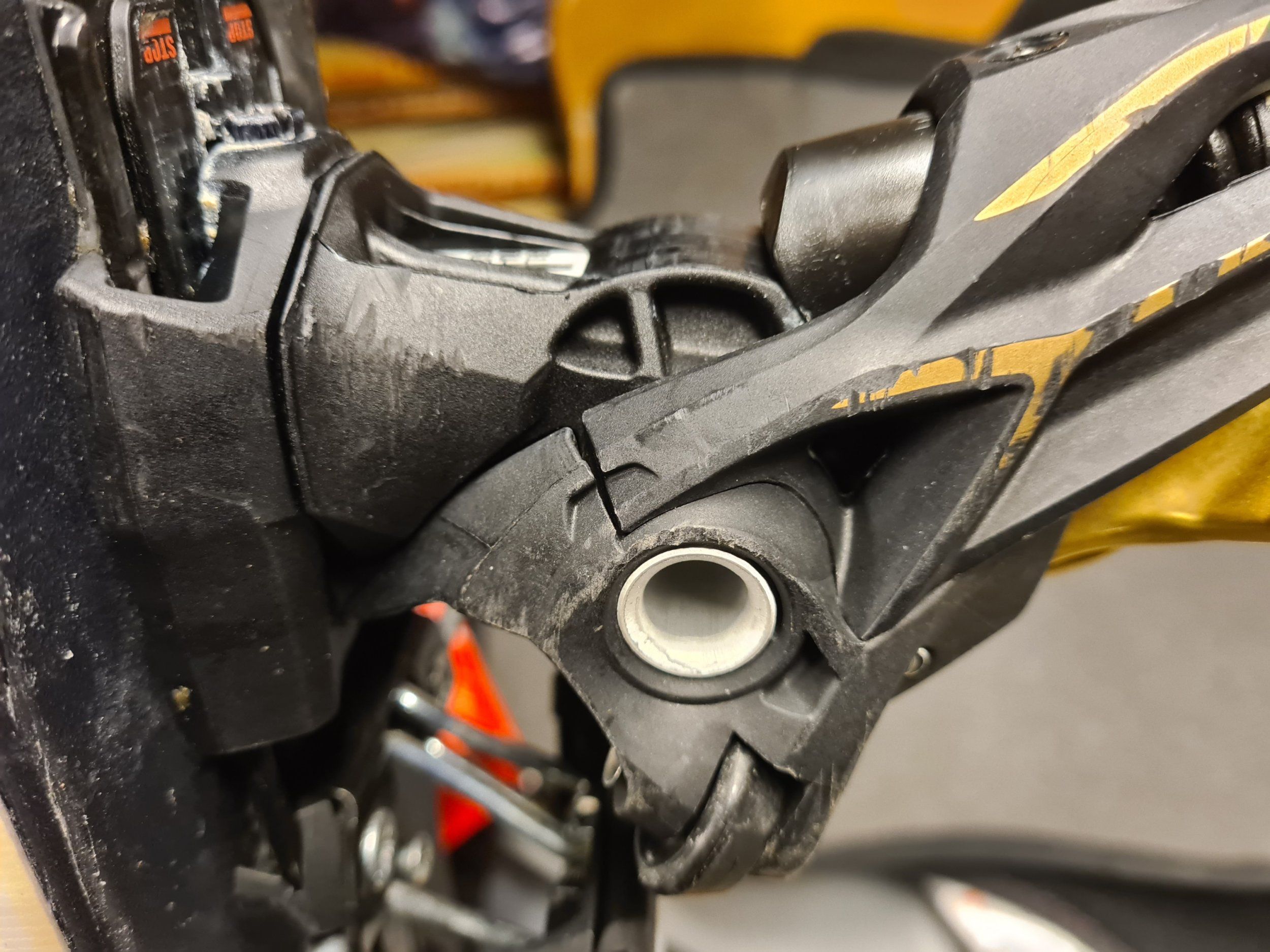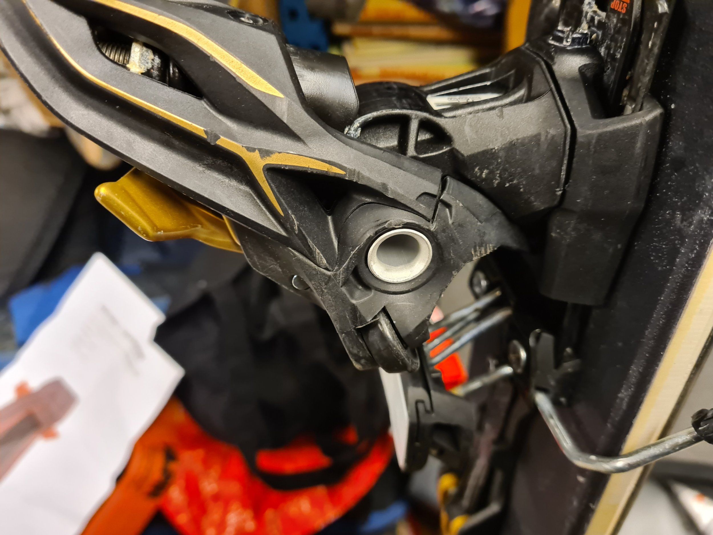 Igår när jag flyttade runt lite skidor upptäckte jag att ena bakbindningen på mina Marker Kingpin 10 är spruckna... se bilder.