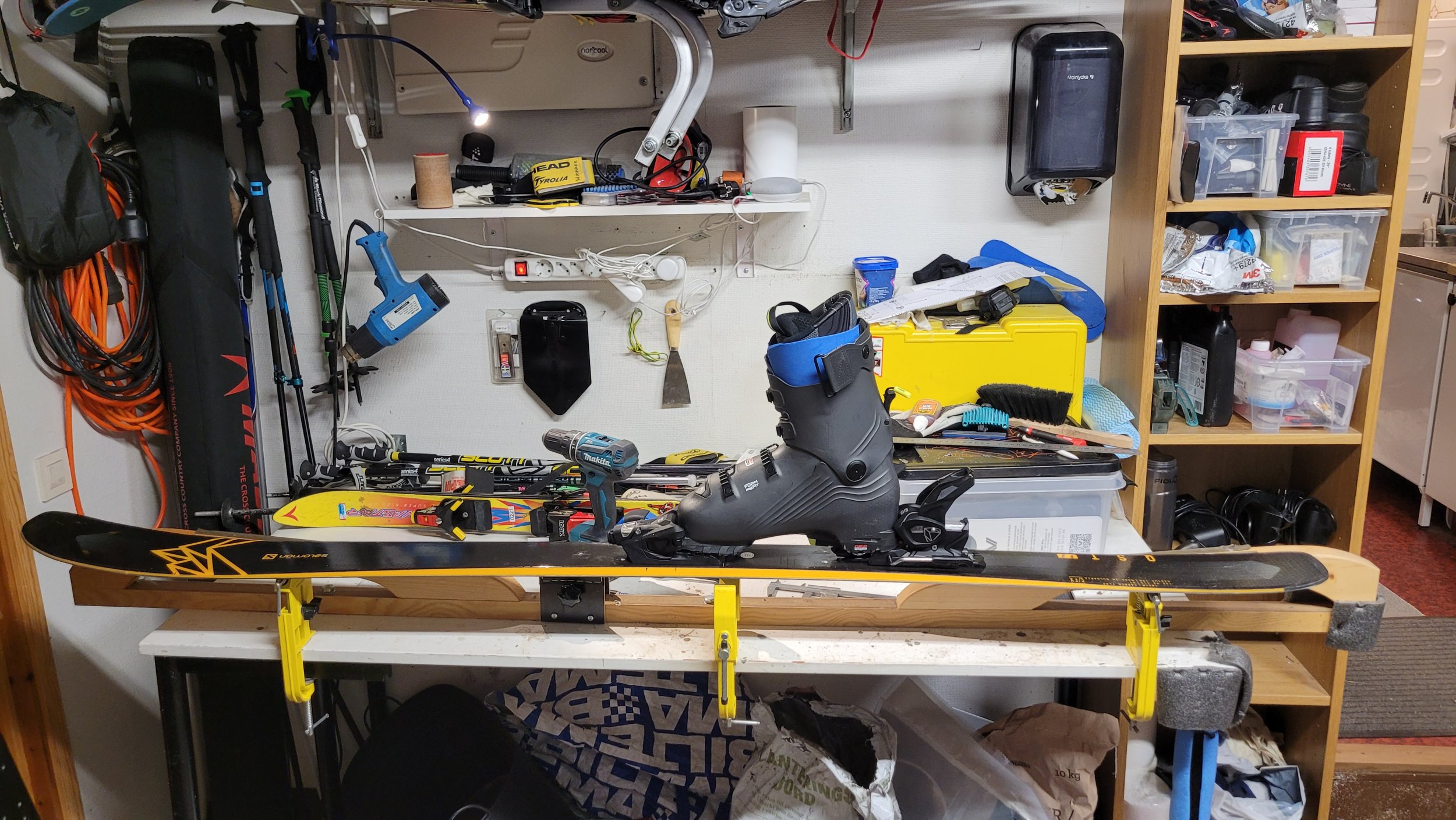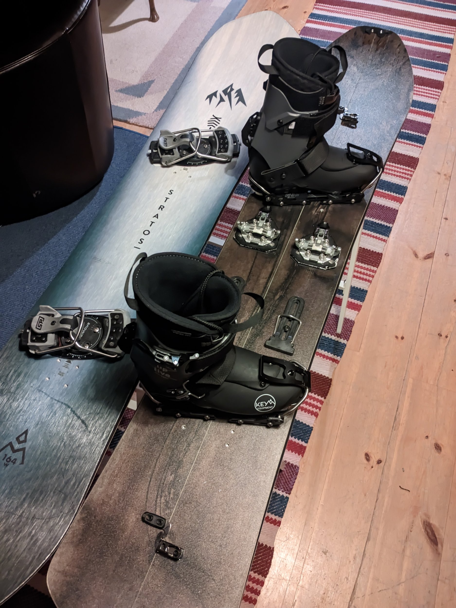 Parallellt så har tanken gnagt om inte Questen skulle kunna funka mer för lek i och ur pist när det är lite uppkört, bara de fick en mer traditionell montering så det går att driva på dem. De har trots allt en del camber. Så, jag åkte iväg på kvällen idag till lokala Stadium och köpte ett par Salomon Strive, som nu har monterats på vad som ser bra ut, efter en hel del "eyeballing" och jämförande med andra gamla lagg. Google var inte mycket till hjälp då varenda kotte verkar ha köpt det här med att stå mitt på skidan och inte attackera längre...
