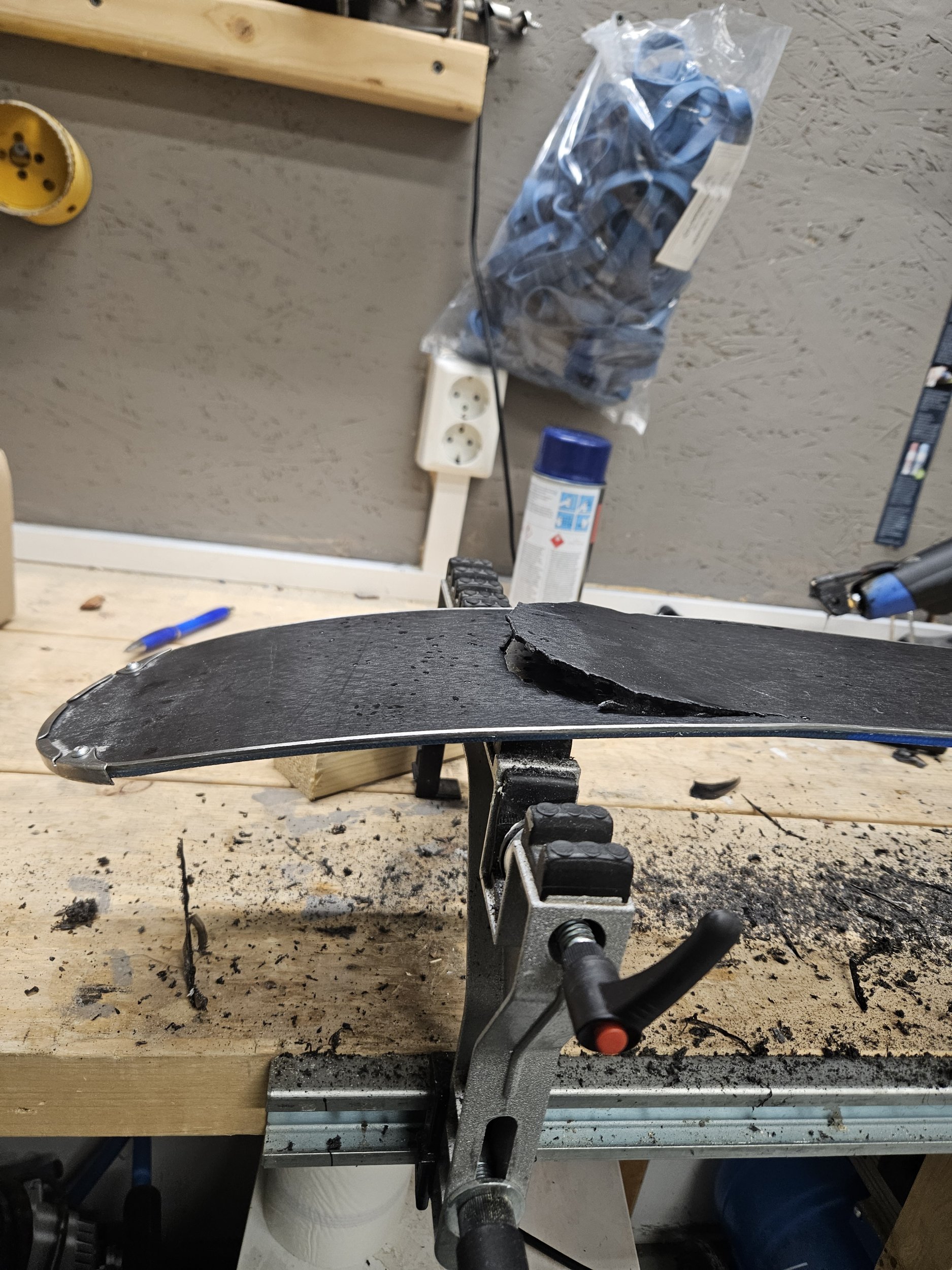 Jag fick denne skida på mitt arbetsbord i skidverkstaden. Tog bara loss bindningen och avaktiverade skidparet på våra hyrskidsinventarier. Hann tyvärr inte fråga kunden vad som hade hänt för det var en annan som hade mötet med denne person. Hade väckt samma fråga som du annars. Man måste ha åkt tvärt in i ett träd, en sten eller i en vägg, men detta blir nog ett stort frågetecken för oss.