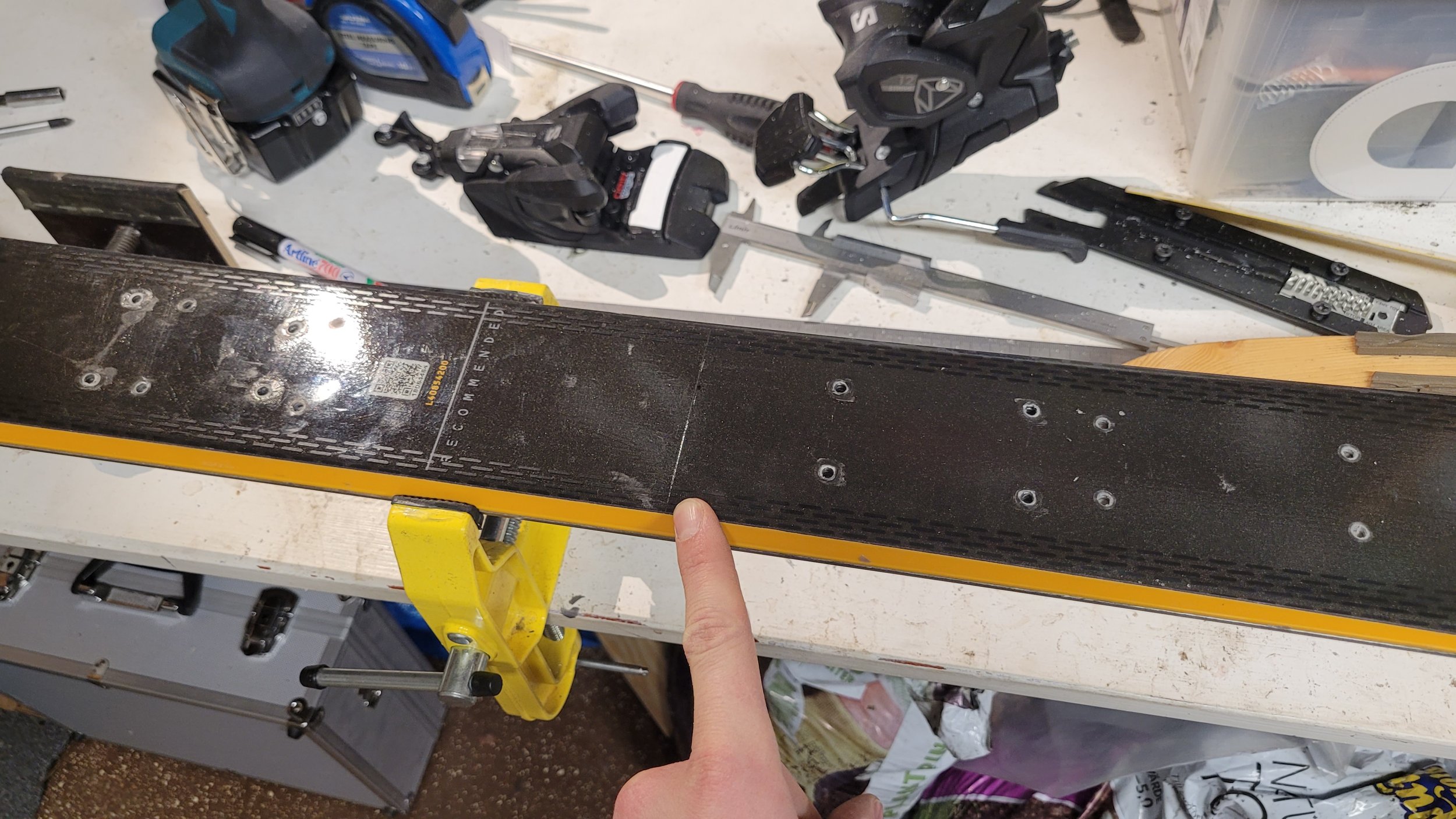 Hur som, det blev 9cm bakom "rekommended", vad nu det är. Eller 20cm bakom true center, om man mäter tip to tail, vilket är rätt meningslöst då spetsarna är så himla långa med sin rocker. Ett tredje sätt att mäta är 14cm bakom center, om man mäter centrum från från skidans skärning. Eller 726mm från aktern.