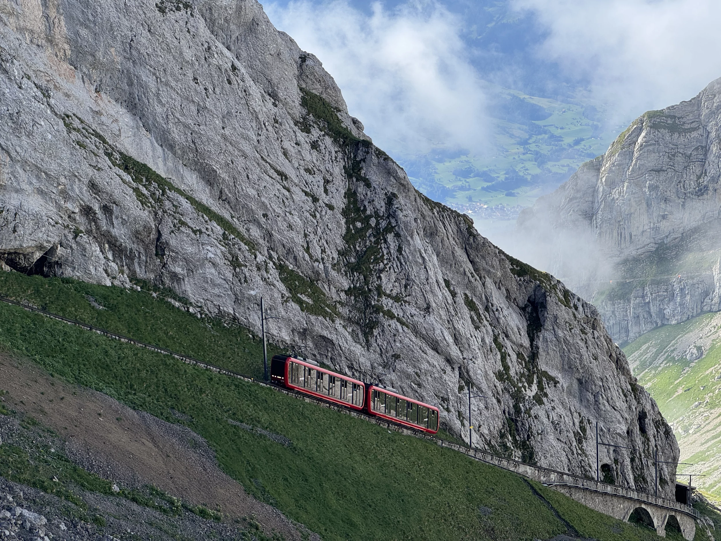 Självklart Pilatus. Om det var på väg upp eller ner minns jag inte.Jag gissar att kuggstångståget är på väg upp på Pilatus?