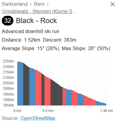 Black rock, precis. Går över till röd längre ner. Ca. 500 fhm från Eigergletscher ner till Wixi under Mönchs mäktiga vägg.Äsch. Har ju åkt den, å därför verkar den bekant ..då finns det väl bara en annan? nr 32? Heter den black rock pist?