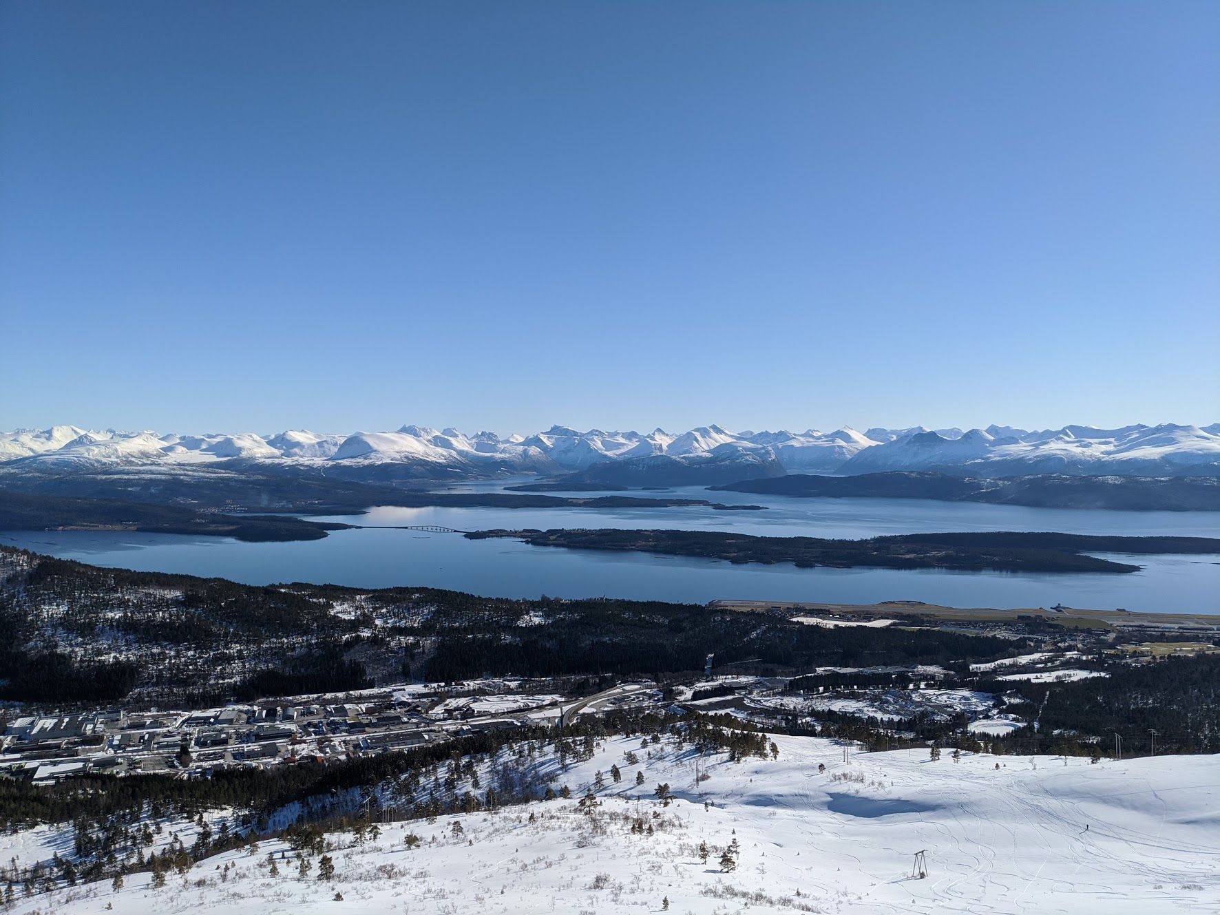 Har dåligt med tid - lämnar över nästa bildgåta till @macl !Stämmer bra det, Tusten Skisenter i Molde. Liten men väldigt fin anläggning. På andra sidan havet/fjorden ser man 222 st toppar i Romsdalen, bland annat Trollväggen, Romsdalshorn, Venjetind.