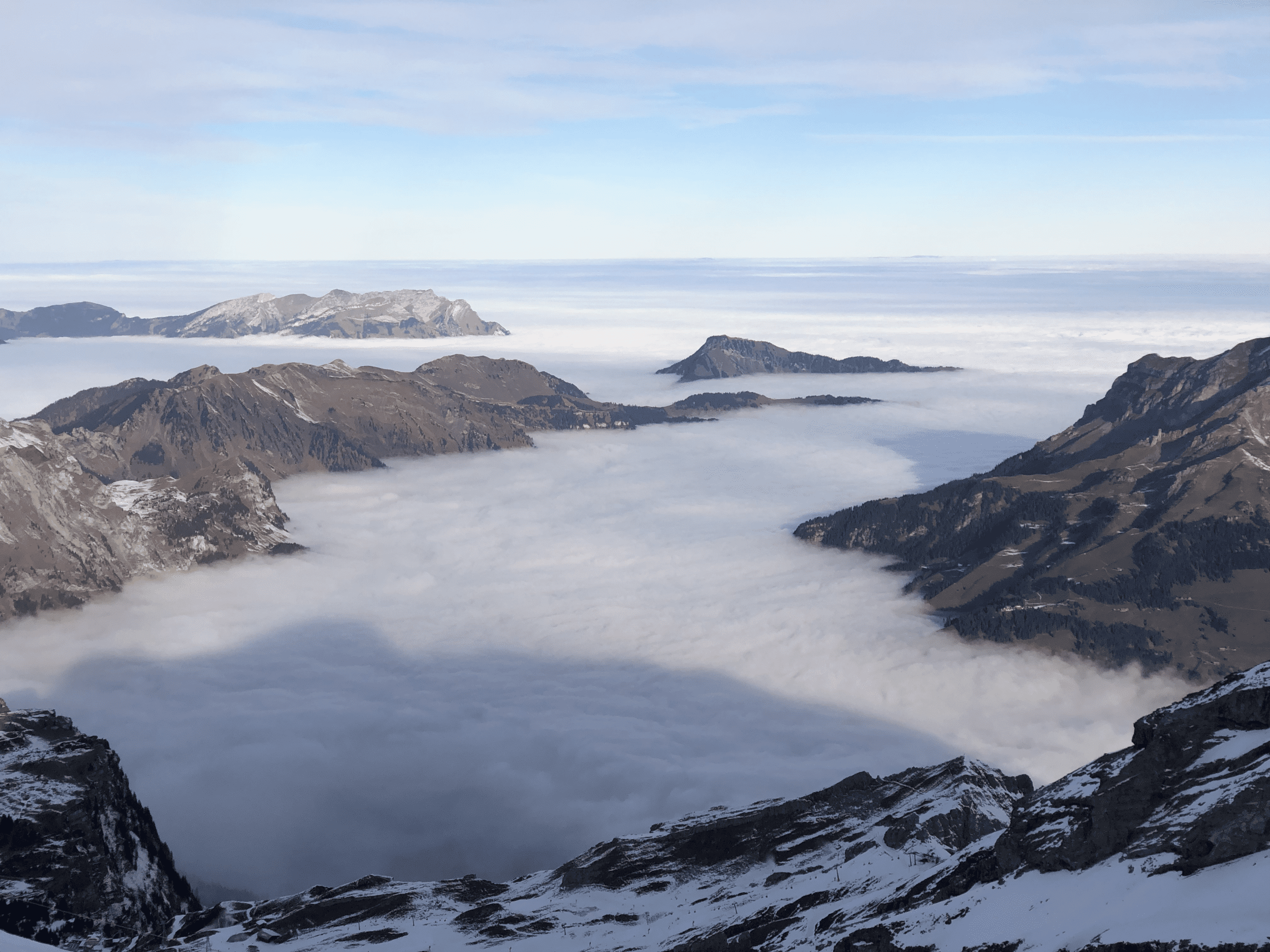 Nu har @STORPOTATEN tagit helg också. Stanserhorn är det jag söker. Bilden tagen från Klein Titlis nära bergstationen. Dimman låg upp till nästan 1600 m den här dagen. Skönt att komma upp över, ibland sitter man under den en hel vecka när det är stabilt högtryck på vinterhalvåret...