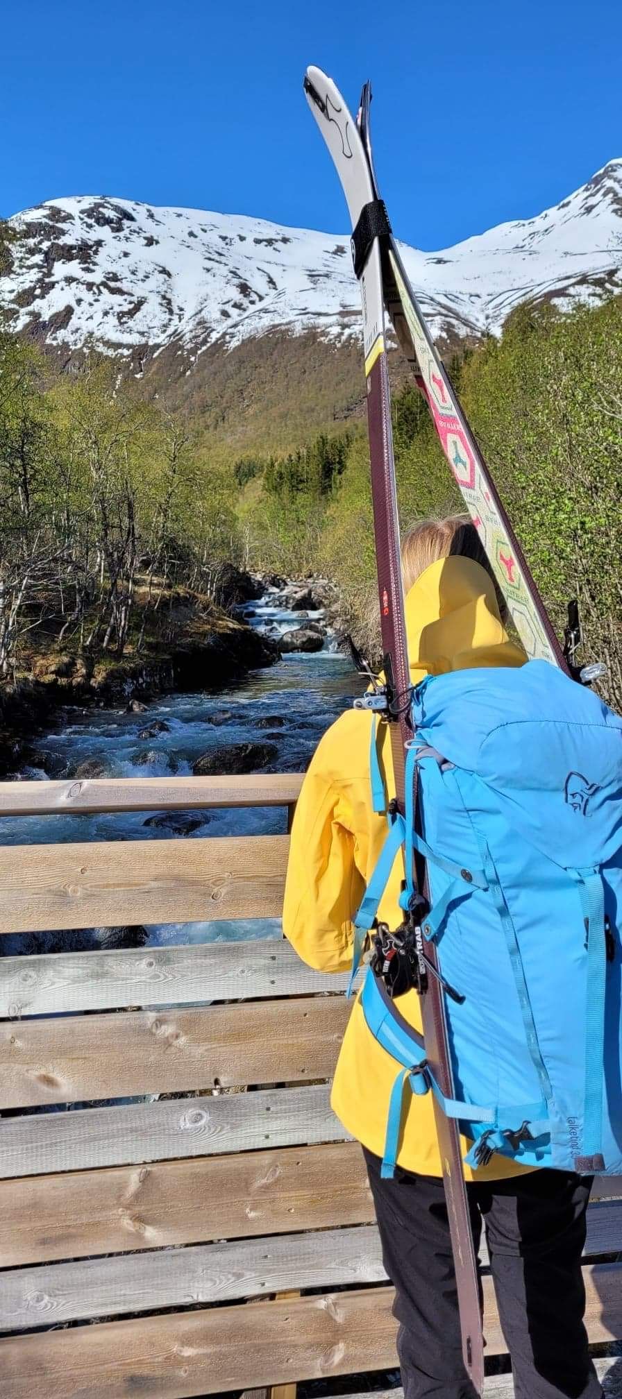 Första bilden är från bron vid brandstadbu. Tittar man mellan hennes skidor ser var lavinen i vintras gick. Toppen säkert flötatind.