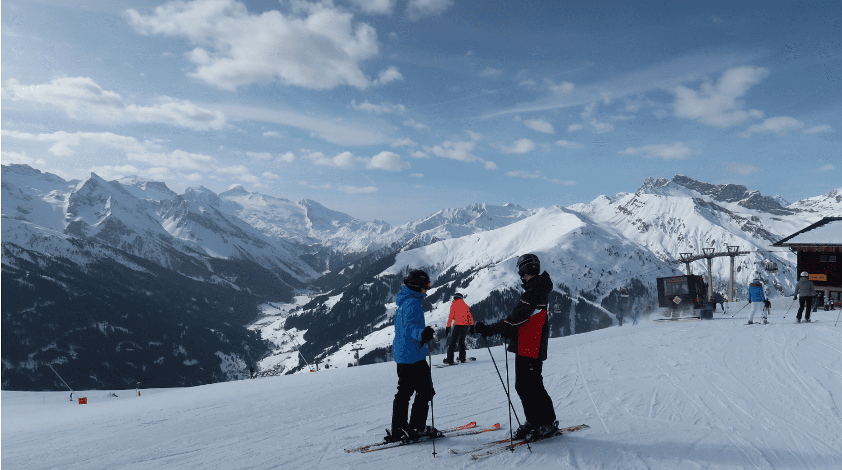 Bra spanat, Davos Rinerhorn som skidområdet heter. Utsikten in i Sertigtal, där bergen inte är typiska för Davos! Mittaghorn och Plattenflue på högersidan, Hoch Ducan gömmer sig bakom Schwarzhorn som är en sidotopp på Leidbachhorn. Utanför bild till vänster ligger Jakobshorn.