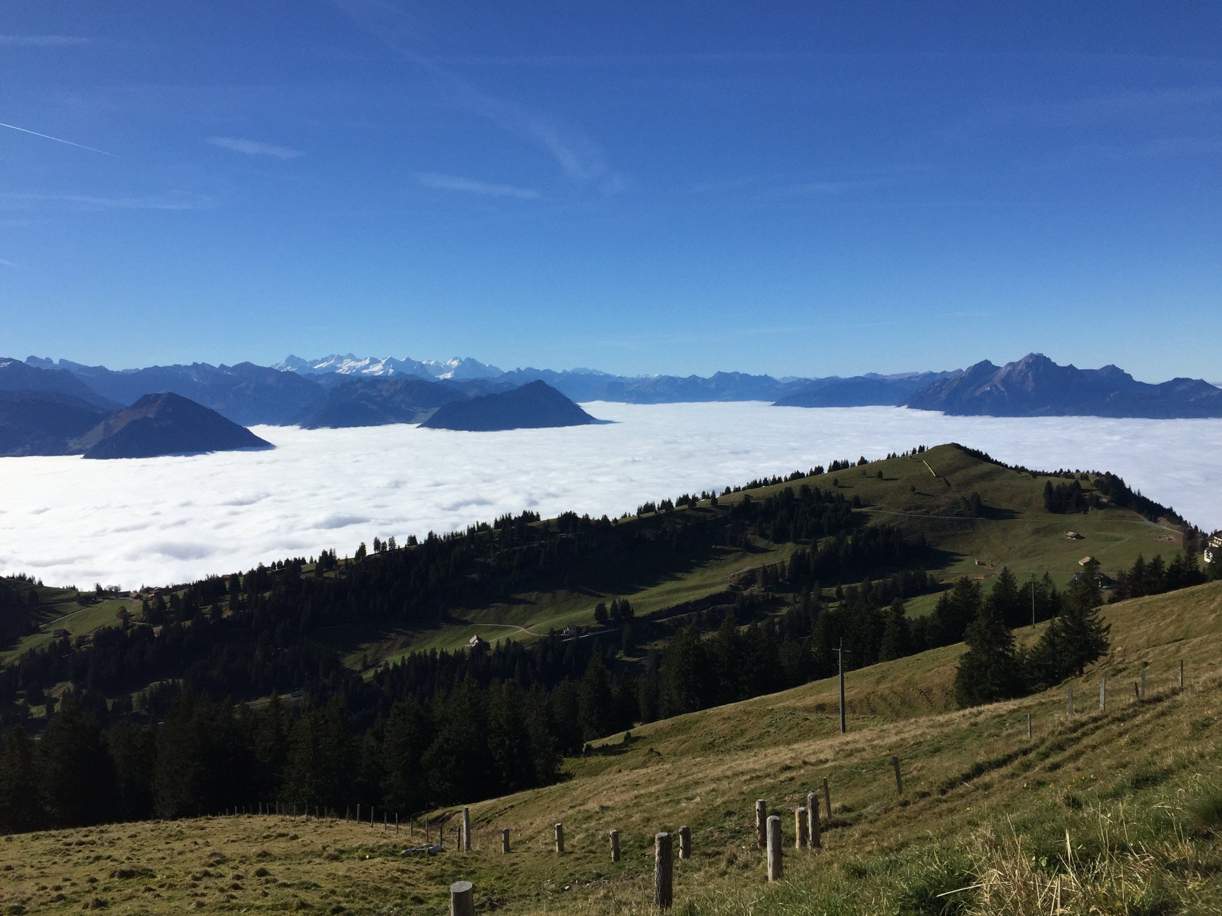 Du är uppe på Rigi Rotstock, rakt fram ser man Stanserhorn och strax under molnen ligger Burgenstock.