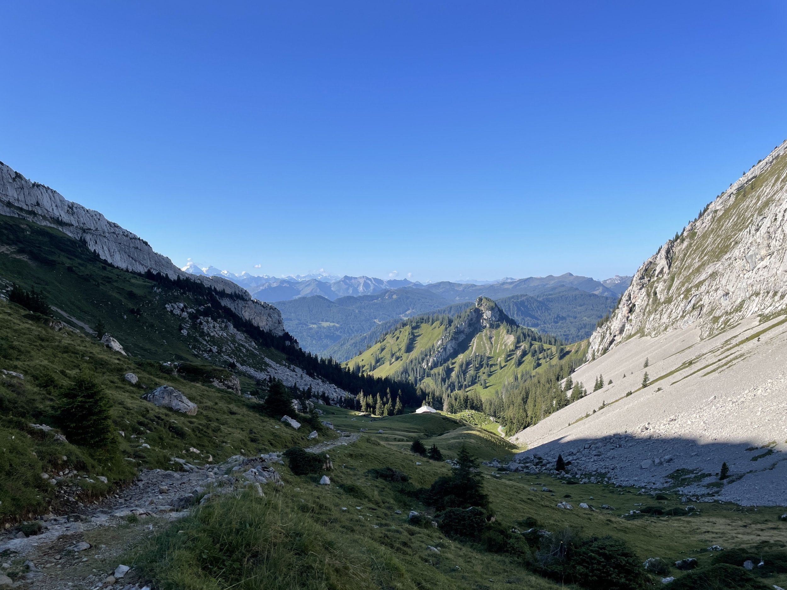 Ja, den där lilla glaciären "Ghiacciaio di Vallegia" som ligger framför, ligger så mycket lägre än den bakre glaciären, att jag lurades att tro att berget bakom var minst 3500m. Den lilla "glassen" ligger på 2470-2800m, och på såna höjder finns det normalt inga glaciärer om det inte är stora höjder och glaciärer som "matar på" ovanifrån. I det här fallet måste det vara en riktig snösamlargryta som ligger i solskugga av bergen intill, annars skulle där aldrig kunna bildas en glaciär.