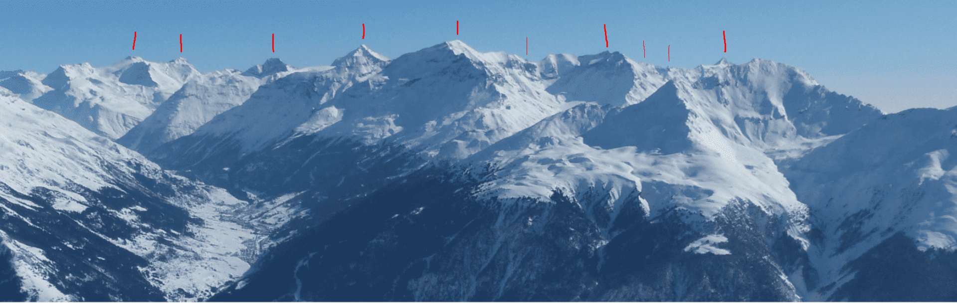 Med en brasklapp för att något av de tre smala strecken där några piggar längre bort precis sticker upp över kammarna, också kan vara 3500+ toppar. Det finns några sådana till där bakom, men det blir för osäkert att ge sig på.😓