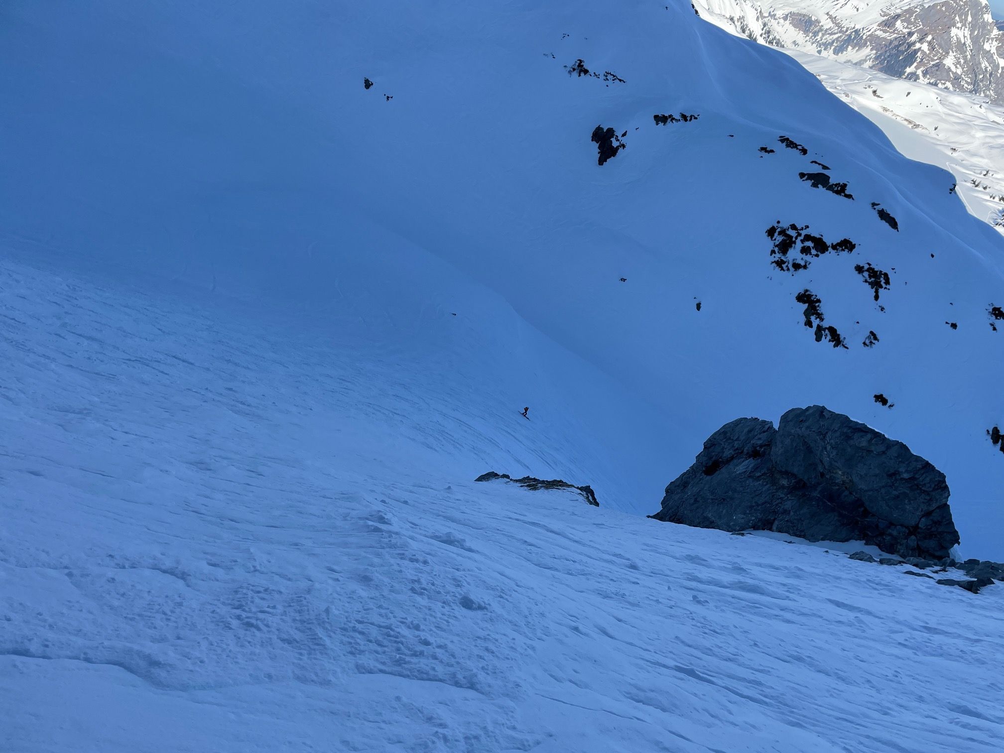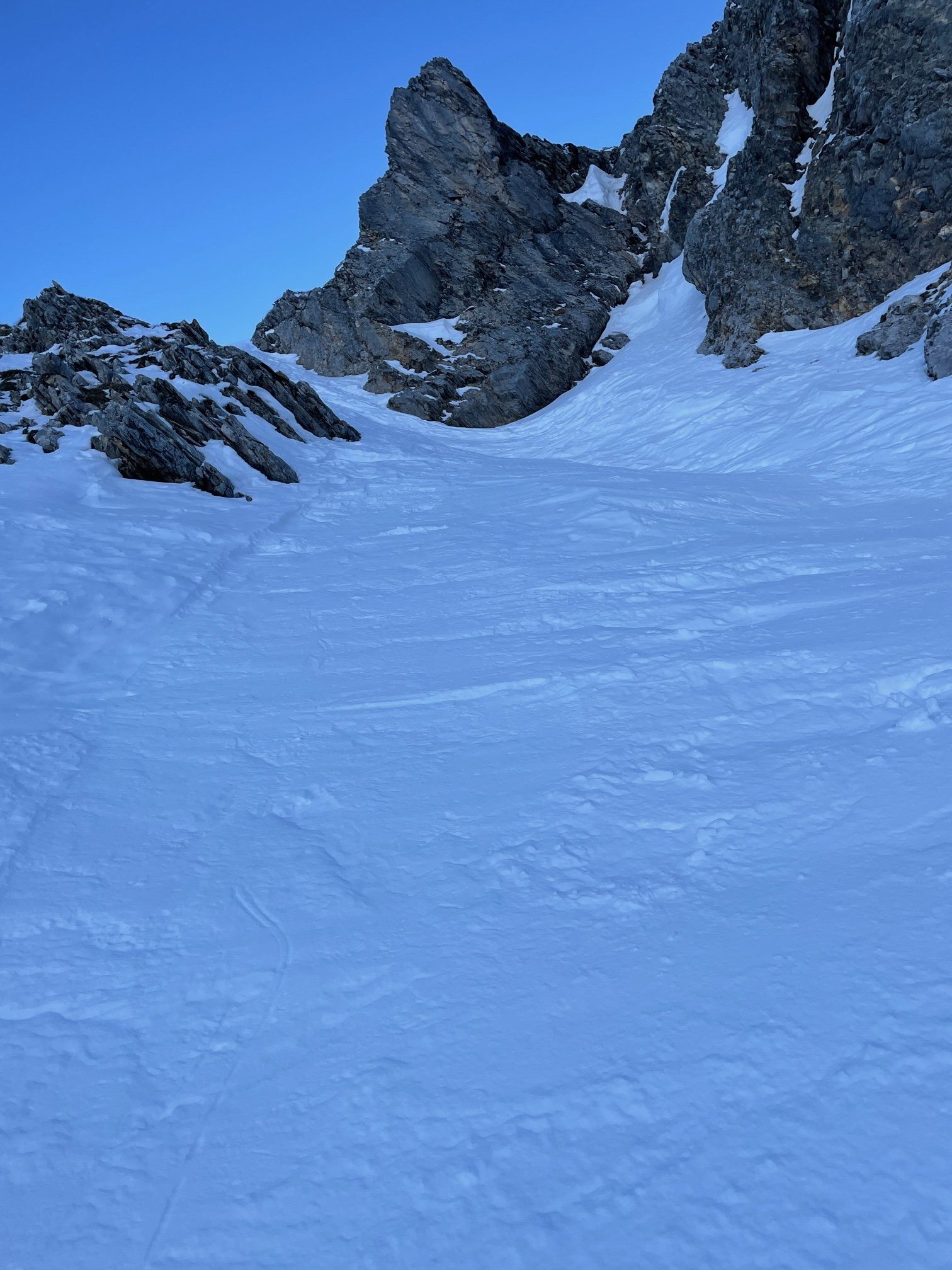 Japp, kör man rakt ner i Steinberg (och hittar) så kommer man till den här lilla rännan. När det är mjuk snö är den svårare att hitta än att åka, nu var det som synes rätt hårt och man fick hålla tungan rätt i mun förbi lite stenar. Otroligt hur känslan av att vad som är brant kan vara så olika bara beroende på snön!Hmmm, Steinberg kommer väl ner där gissar jag.