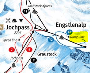 Engstlenalp är det jag söker, precis. Nu fattar jag Bump line också, de har som en liten mini "skicrossbana" där för nybörjare som de tydligen kallar det. Röda pisten som kommer ner från Jochstock som syns i bild, och bakom så klart bergstationen på Klein Titlis.