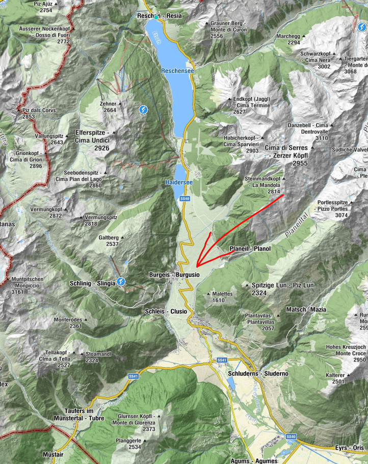Fastän dalen från Reschensee är bred och platt så lutar den så mycket utför att landsvägen går i serpentiner ner (se karta nedan).